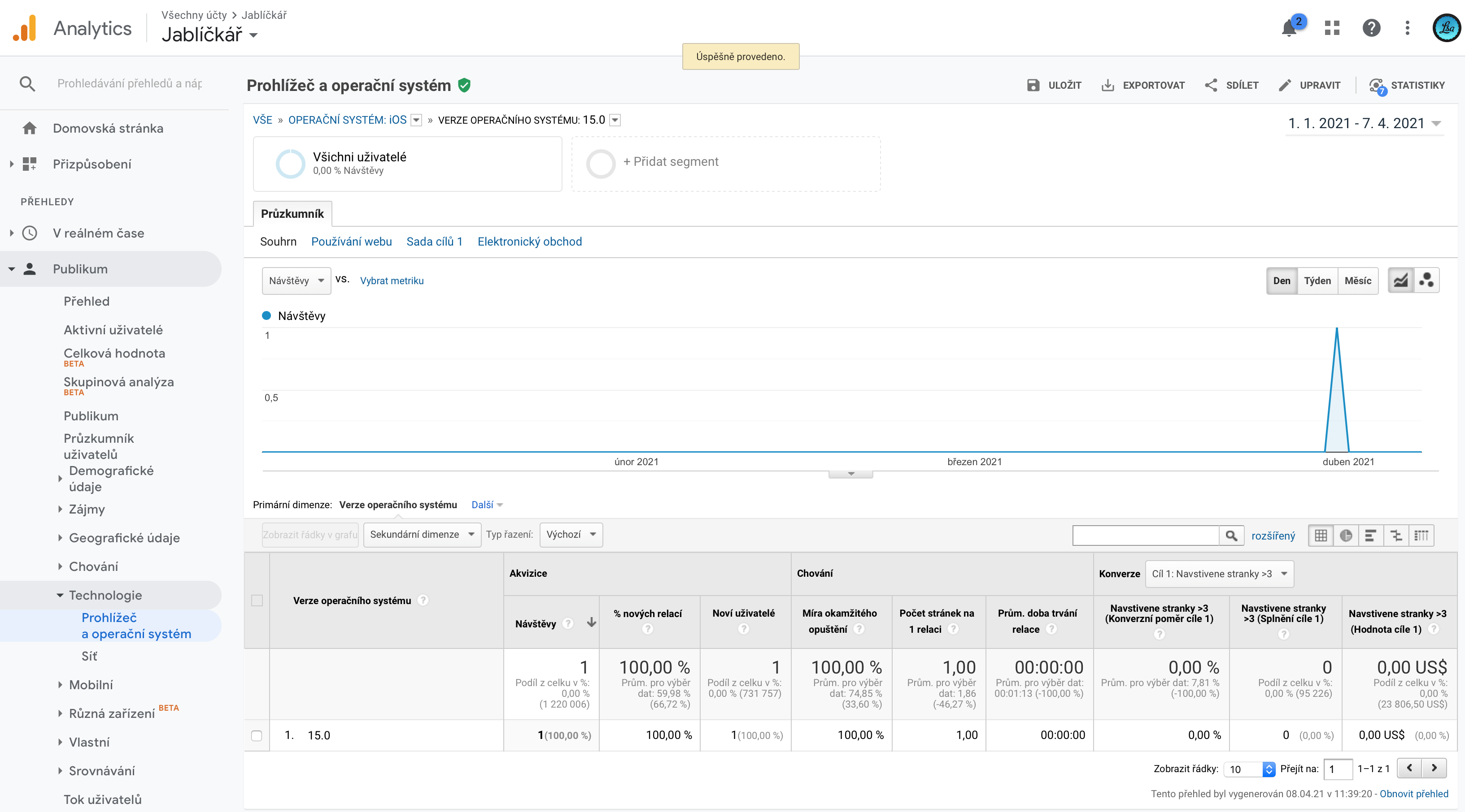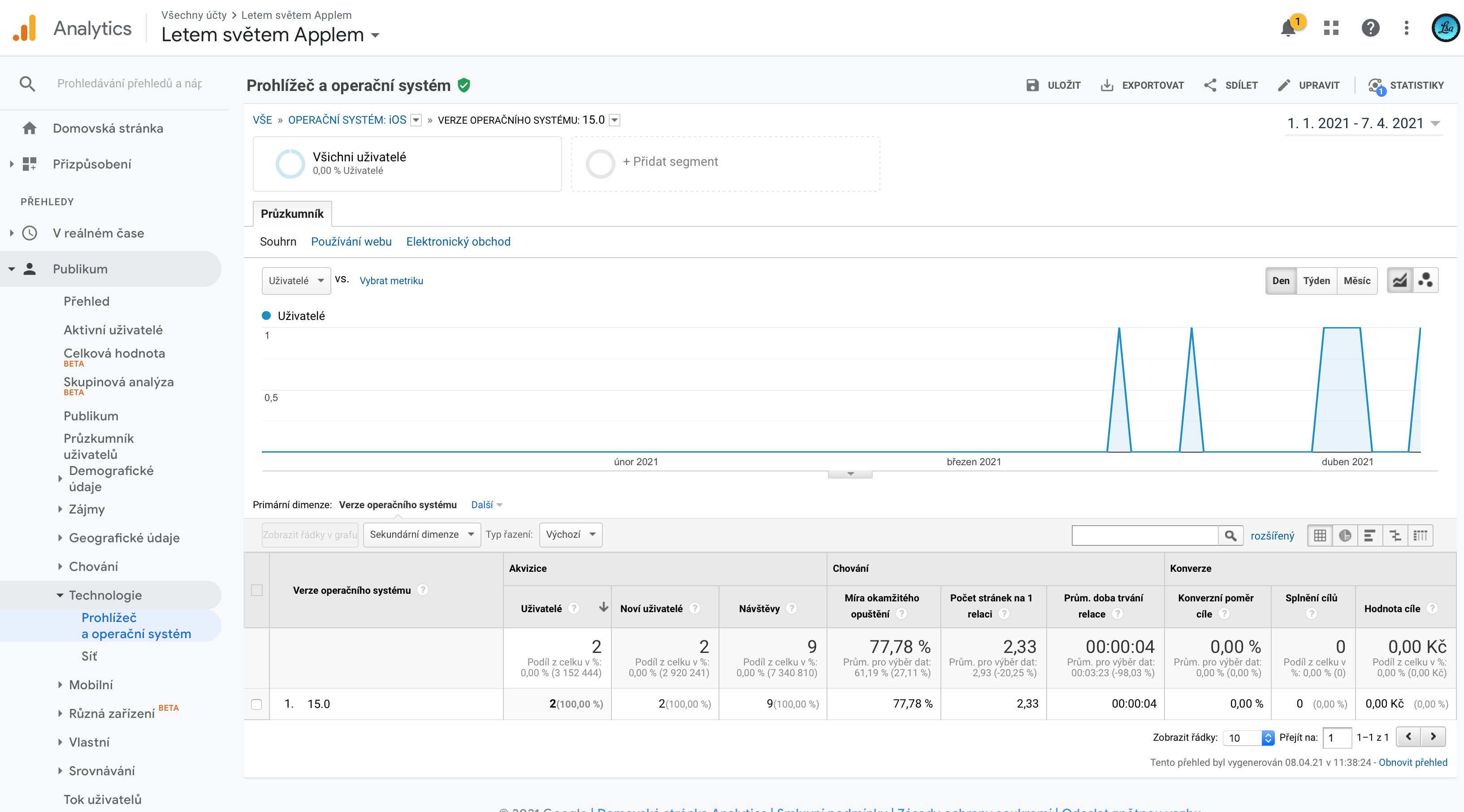 První návštěvu z iOS 15 registrujeme také na našem druhém Apple magazínu Jablíčkář.cz, na kterém se první uživatel s iOS 15 objevil dokonce až na přelomu března a dubna letošního roku. V obou případech se jedná o návštěvy, které jsou pouze testovací a operační systém se na webové stránce oproti standardním 3:23 minutám klasických uživatelů zdrží pouze několik málo vteřin.