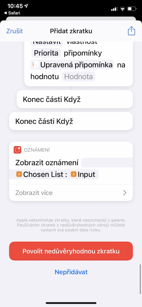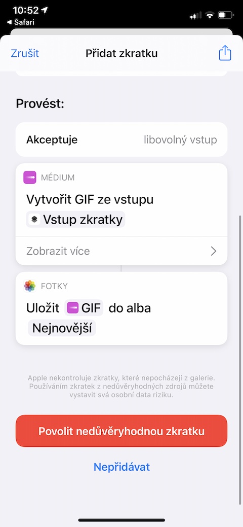 Se závěrem týdne vám opět přinášíme přehled dalších užitečných zkratek pro iOS. Než se pustíte do jejich instalace a zkoušení, připomínáme, že je potřeba každou zkratku otevřít v prostředí prohlížeče Safari na iPhonu, do kterého ji budete chtít nainstalovat. Ujistěte se také, že jste v Nastavení -> Zkratky povolili používání nedůvěryhodných zkratek.