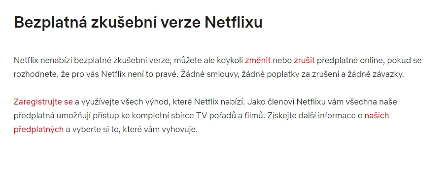 Dlouho platilo, že Netflix bylo možné vyzkoušet po 30 dní zcela zdarma. Podmínkou bylo pouze k účtu „přidat kartu“. Facebooková stránka Netflix CZ + SK Fans přišla s informací, že jednička mezi vidostreamovacími službami v tichosti výše zmíněnou možnost odstranila. Byť není k tomuto kroku žádné oficiální potvrzení, na stránkách Netflixu se již můžete dočíst následující: „Netflix nenabízí bezplatné zkušební verze, můžete ale kdykoli změnit nebo zrušit předplatné online, pokud se rozhodnete, že pro vás Netflix není to pravé.“ Jaký máte názor na tento krok?