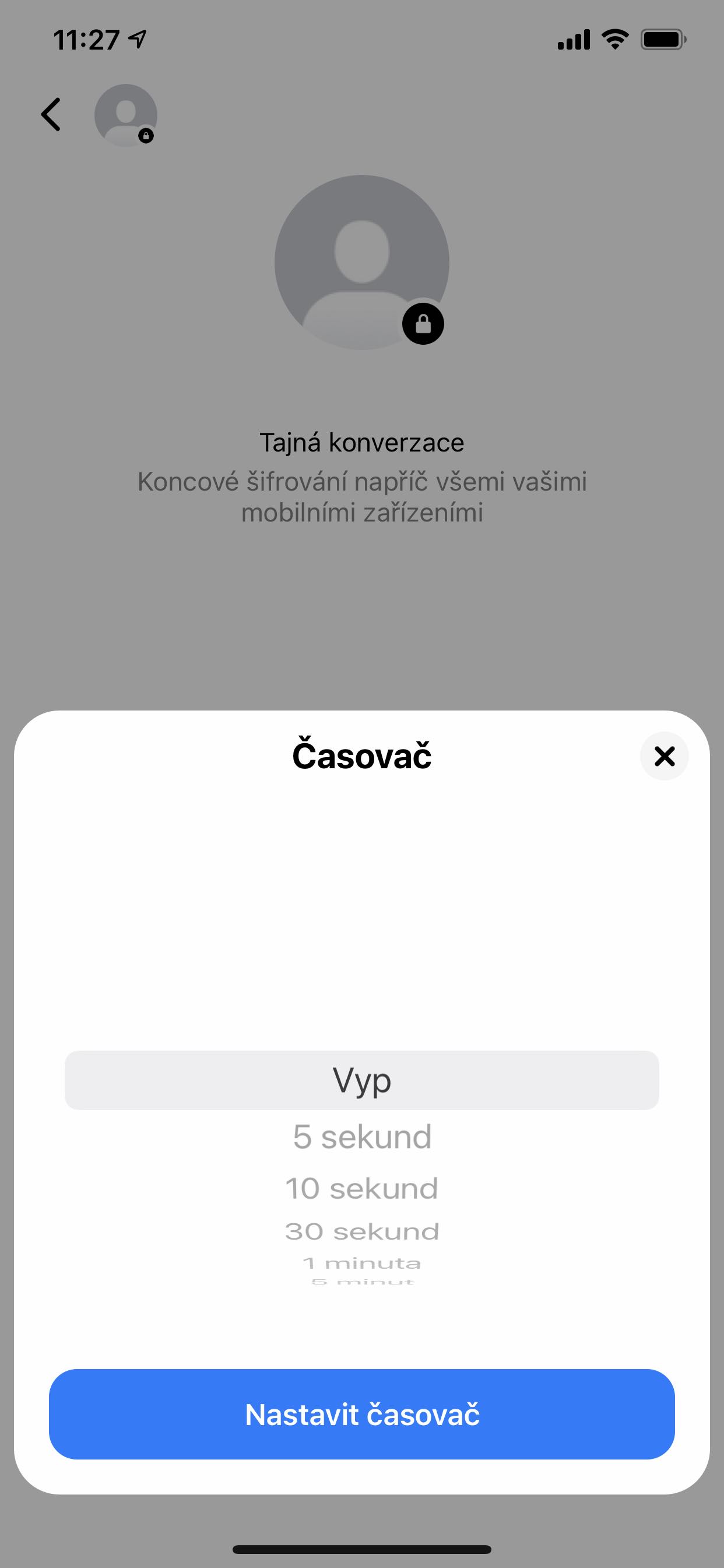 Když pošlete zprávu v tajné konverzaci, můžete taky nastavit, za jak dlouho má zpráva z konverzace zmizet. Zpráva zmizí po uplynutí nastaveného času od chvíle, kdy si ji druhý člověk zobrazí. V textovém poli k tomu klepněte na symbol hodin a poté v roletovém menu vyberte čas. Klepnutím na Nastavit časovač jej nastavíte. Když tak učiníte, ikona hodin změní barvu, aby vás informovala o tom, že je časovač aktivní.
