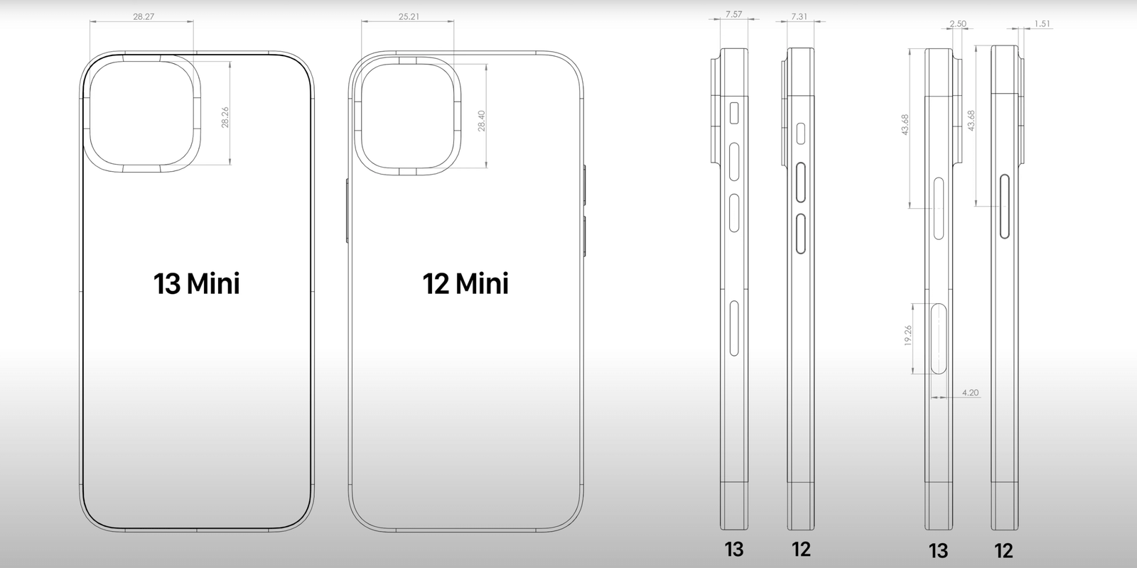 Jelikož se mají iPhony 13 a 13 mini lišit stejně jako v loňském roce jen v úhlopříčce displeje, je potřeba i u větší “třináctky” počítat s fotomodulem s rozměry uvedenými výše. Co se pak týče rozměrů těla, ty budou prakticky 100 % též poměrově odpovídat iPhonu 13 mini – tedy jinými slovy zůstanou u výšky a šířky zachovány, u tloušťky pak povyrostou. Slovy čísel to znamená, že výška iPhonu 13 bude velmi pravděpodobně 146,7 mm, šířka 71,5 mm a tloušťka 7,57 mm.