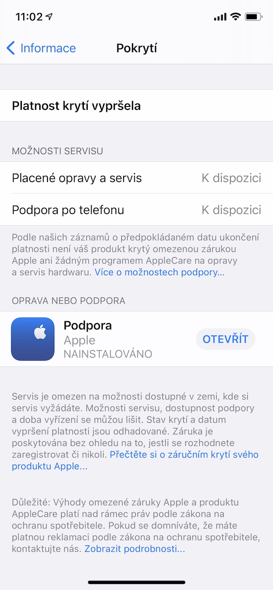 Jak už jsem zmínil výše – pokud se v nastavení zobrazí, že platnost krytí vypršela, tak to nutně nemusí znamenat, že už nemáte nárok na uplatnění záruky. Pokud je vaše zařízení staré do dvou let, tak je pořád možné záruku uplatnit přímo u prodejce, kde jste zařízení kupovali. Dobrou zprávou je, že technickou podporu můžete využít i po záruce. Buď stačí zavolat na linku Applu – telefonní číslo 800 701 391 – anebo doporučuji, abyste si stáhli perfektně zpracovanou aplikaci Podpora Apple. Tato aplikace je k dispozici naprosto zdarma v App Storu a najdete v ní například informace o opravách, co můžete dělat v případě nefunkčnosti zařízení, dále informace o předplatných, heslech, zabezpečení, aktualizacích a další.