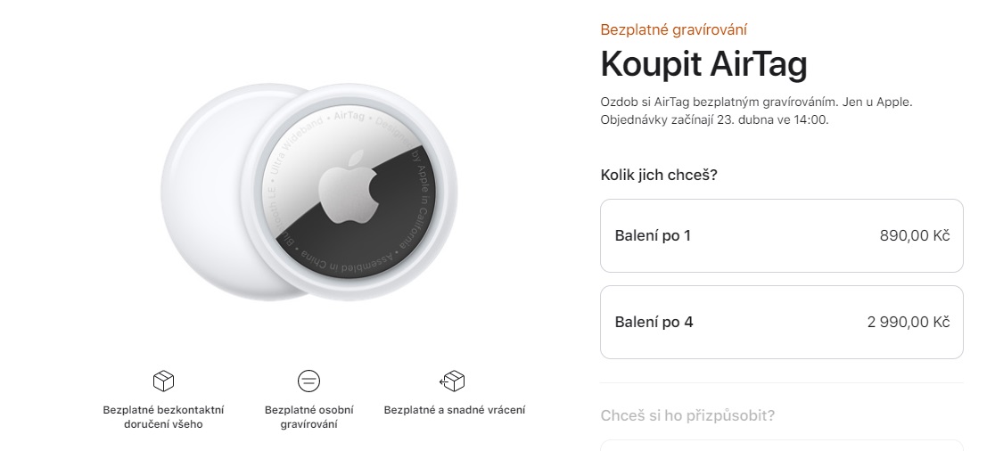 Cena lokalizátoru AirTag je konečně venku. Přestože to s tímto produktem vypadalo dlouhodobě všelijak a nejeden jablíčkář už si myslel, že se ho snad ani nikdy nedočkáme, Apple jej nakonec na své první Keynote roku 2021 vytáhl z rukávu, světu představil a v brzké době se jej chystá začít prodávat. Na kolik tedy tato novinka vyjde? Cena lokalizátoru AirTag v našich končinách je 890 korun. Balení po 4 kusech vás vyjde na 2990 korun. Gravírování je bezplatné. Zaujal vás tento produkt?