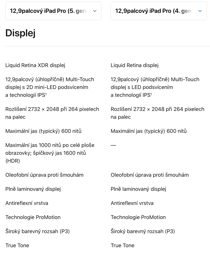 11palcový model má naprosto totožný displej s loňským modelem, změny se odehrály jen u 12,9palcové verze. Ta přináší nový Liquid Retina Display XDR s technologií mini-LED. Rozlišení i typický jas zůstaly stejné, maximální a ten pro HDR už ale značně poskočil.