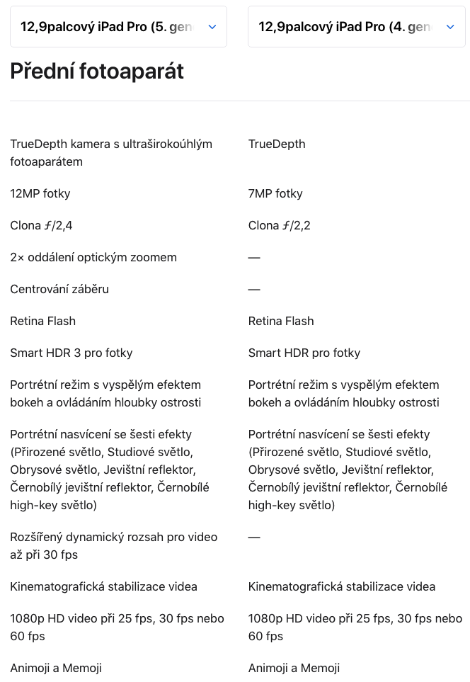 U hlavního fotoaparátu se toho moc nezměnilo, i když má novinka alespoň rozšířený dynamický rozsah. To hlavní se dělo především z čelní strany. TrueDepth kamera totiž dostala 12MPx ultraširokoúhlý fotoaparát s možností centrování záběru a už umí i portréty s všemi jejich nasvíceními i určením hloubky ostrosti před samotným pořízením fotografie.