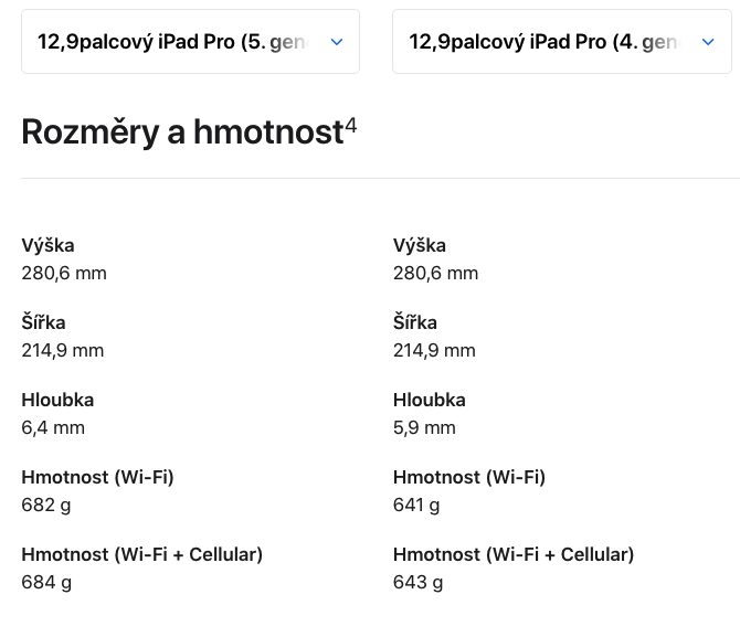 I když je 12,9palcový iPad Pro 2021 stejný co se jeho šířky a výšky týče s předchozí generací, trošku přibral, za což pravděpodobně může technologie displeje. Jeho hloubka je 6,4 mm, iPad Pro 2020 je hluboký 5,9 mm. To se musí promítnout i na váze, kdy loňský model váží 641 g respektive 643 g ve verzi Cellular, novinka pak má 682 g či 684 g. Podíváme-li se na 11palcový model, tak u něho se proporce šasi neměnily, i když i on přibral z 466 na 471 g a z 468 na 473 g.