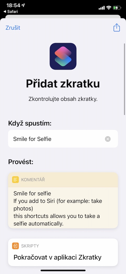 Pořizujete často selfies a chtěli byste si tento proces co možná nejvíce zjednodušit a zpříjemnit? Nainstalujte si do své galerie zkratek zkratku s názvem Smile for Selfie. Jedná se rychlý sled akcí, který začíná odpočtem, pokračuje pořizením snímku z předního fotoaparátu vašeho iPhonu a končí uložením vašeho autoportrétu do galerie. Zkratka vyžaduje přístup k fotoaparátu a nativním Fotkám na vašem iPhonu.