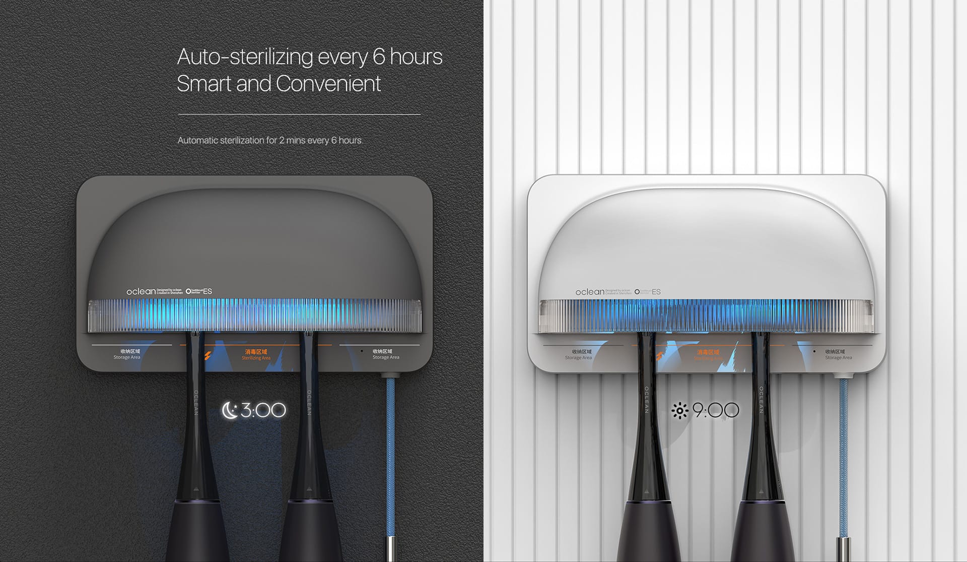 Dalším poměrně zajímavým produktem je Oclean S1. Prakticky se jedná o skvělý sterilizátor a držák pro zubní kartáčky v jednom, který se navíc pyšní futuristickým designem. Ten dokáže pojmout kartáčky celé rodině (konkrétně až pět), přičemž tři pozice přímo dezinfikuje. K tomu využívá UVC-LED záření pro bezpečnou sterilizaci a odstraní tak 99,99 % bakterií, virů a ostatních.