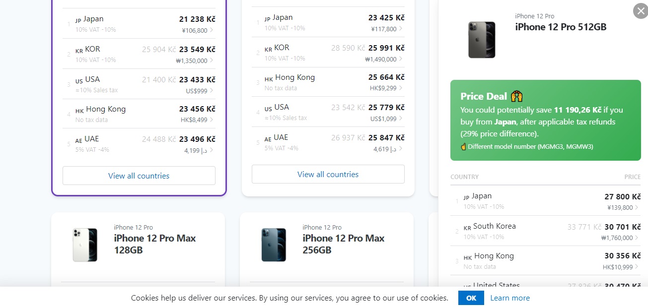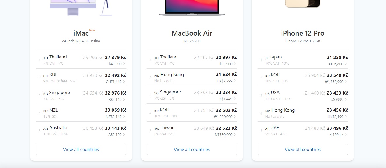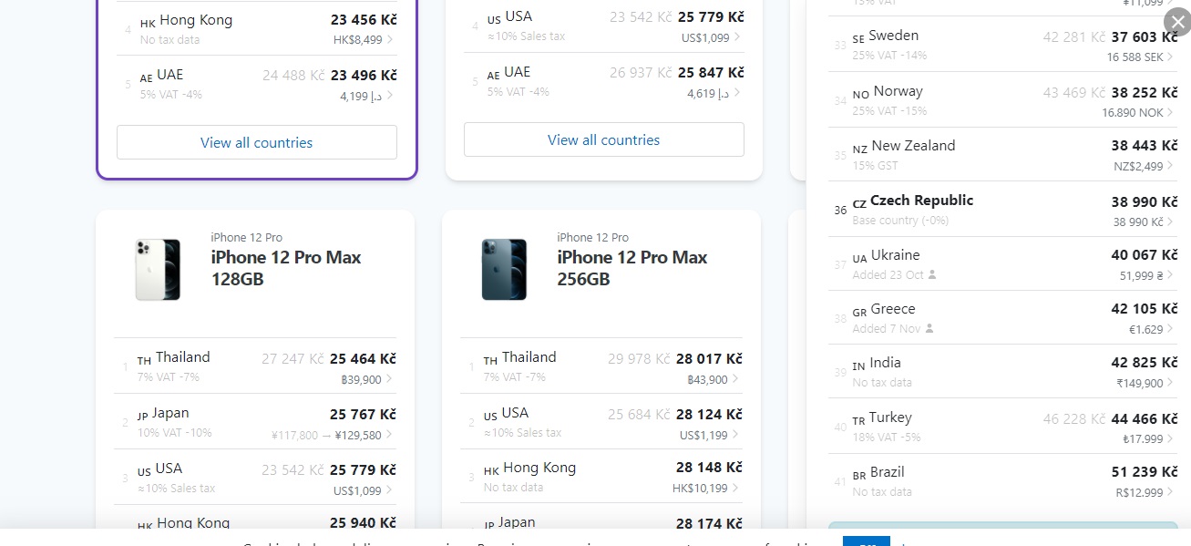 Ceny vám samozřejmě seřadí od nejlevnějšího po nejdražší, přičemž uvidíte přepočet na české koruny (či měnu, která pro vás bude relevantní). Je ovšem třeba dodat, že tabulky nelze číst jako „Písmo svaté“. Různé země mají různé daňové systémy. V Evropě se například započítává DPH přímo do kupní ceny daného produktu. V některých zemích, jako například v Kanadě a USA, se daň neuvádí a vypočítává se následně dle bydliště nakupujícího a obchodu, kde produkt nakoupil. Samozřejmě je také třeba brát v potaz fakt, že peníze mají pro lidi v různých zemích různou hodnotu. Sledovat výkyvy je ale nesmírně zajímavé. Podíváme-li se třeba na iPhone 12 Pro 512 GB, nejlevnější je dle tabulky v Japonsku, kde v přepočtu na naši měnu je k mání už za 27 800 korun. U nás jej můžete mít za 38 990 korun, což je v tabulce až 36. příčka. Nejdražší je pak tento model v Brazílii, kde za něj, opět v přepočtu na naši měnu, zaplatíte 55 181 korun.