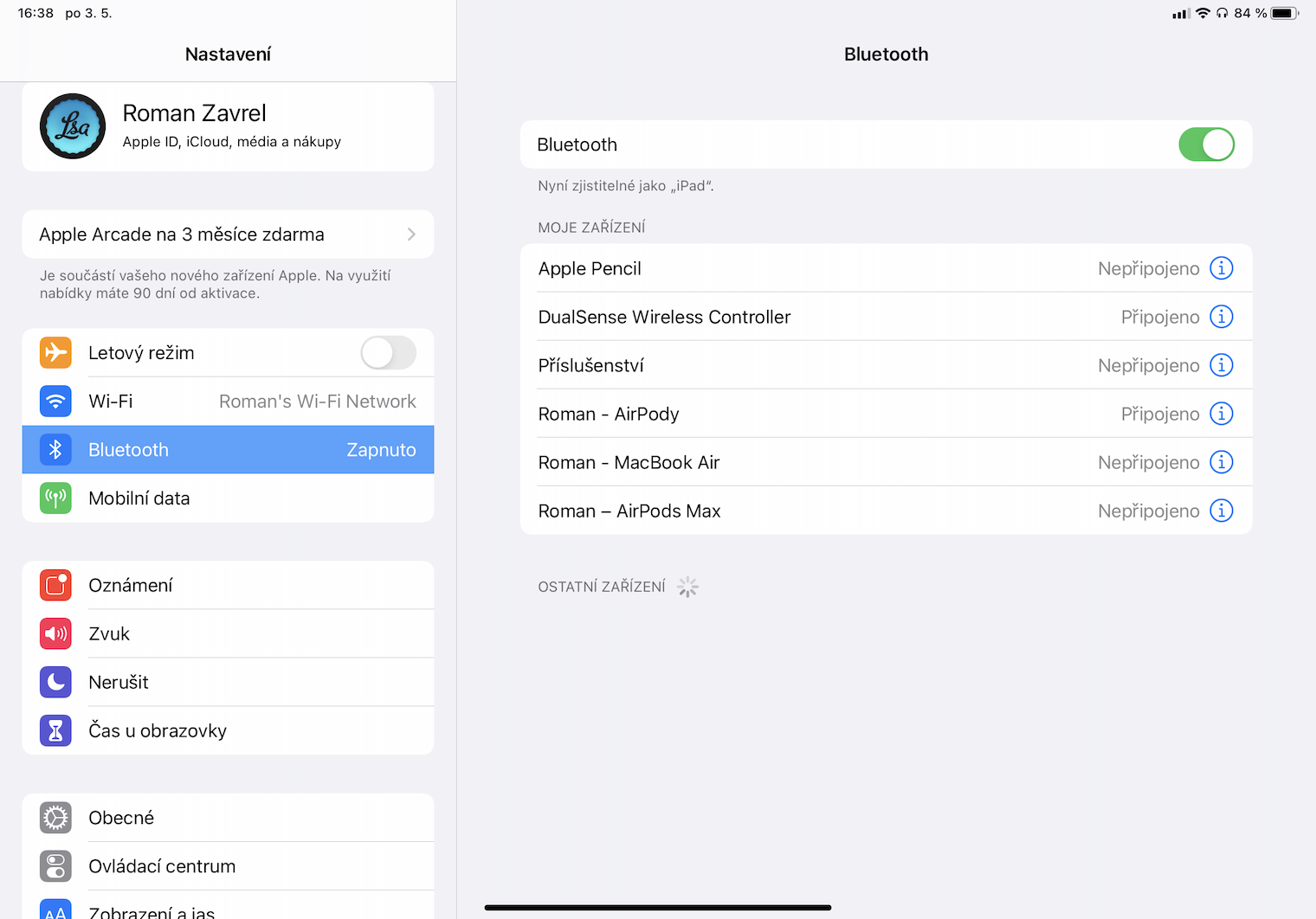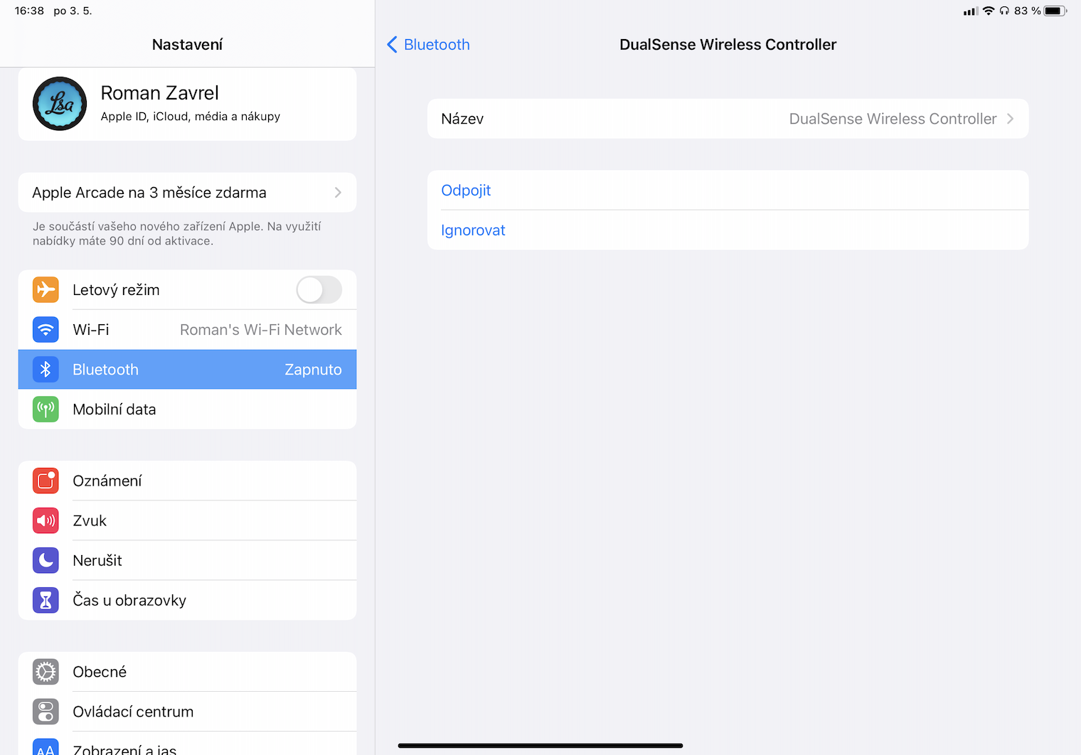- Ovladač se rozbliká na modro a v nastavení iPhone nebo iPadu se vám objeví v Bluetooth položka DualSense Wirelles Controller.