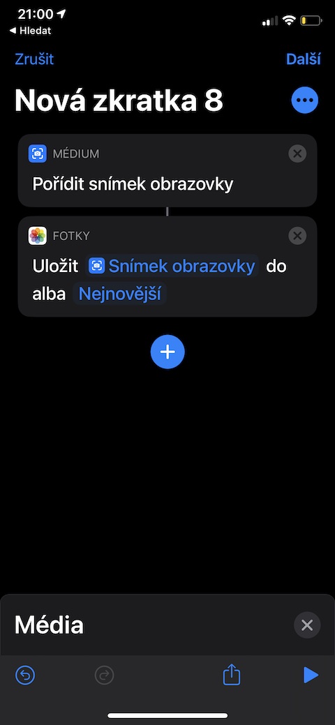 Screenshoty na svém iPhonu určitě čas od času pořizuje každý z nás. Součástí pořízení snímku obrazovky na iPhonu je také okamžité zobrazení náhledu screenshotu – poté, co na tento náhled v levém dolním rohu displeje iPhonu klepnete, s ním můžete dále pracovat. Připadá vám ale tato akce spíše rušivá? Na iPhonu s iOS 14.5 můžete vytvořit zkratku, při jejímž použití nedojde k zobrazení miniatury. Nejprve na svém iPhonu spusťte Zkratky a v pravém horním rohu klepněte na „+“ pro přidání nové zkratky. Klepněte na Přidat akci -> Média -> Pořídit snímek obrazovky. Poté klepněte na „+“ -> Uložit do fotoalba. Klepněte na Další v pravém horním rohu a zkratku pojmenujte. Poté zamiřte do Nastavení -> Zpřístupnění -> Dotyk, kde k poklepání na zadní stranu přiřadíte nově vytvořenou zkratku.