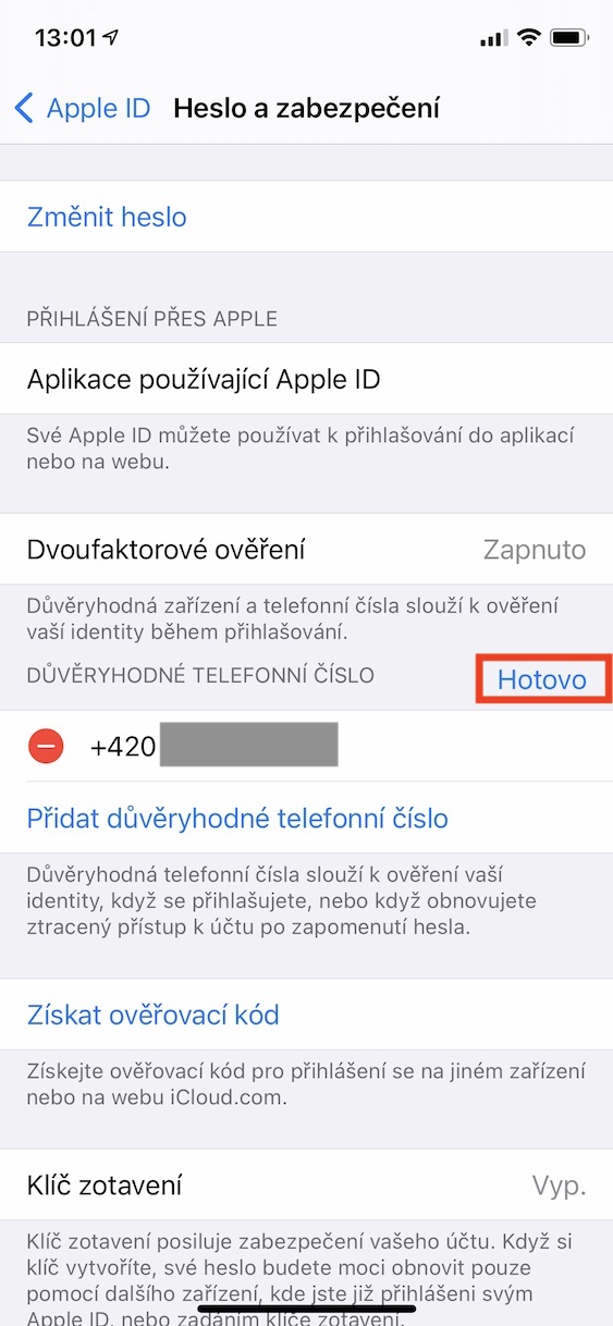 Pomocí výše uvedeného způsobu lze na iPhone změnit důvěryhodné telefonní číslo pro dvoufaktorové ověření. Pokud máte k účtu přiřazené pouze jedno důvěryhodné telefonní číslo a budete jej chtít odstranit, tak se vám to nepodaří. Účet s dvoufatkrovým ověřením totiž musí mít přiřazené alespoň jedno číslo. V tomto případě je tedy nutné prvně přidat druhé číslo a až po přidání to původní odstranit. Jakmile budete mít vše změněno, tak stačí klepnout na Hotovo. Dvoufaktorové ověření byste měli mít za každou cenu aktivní – pokud nemáte, stačí o políčko výše rozkliknout pole Dvoufaktorové ověření, které pomocí pokynů aktivujte.