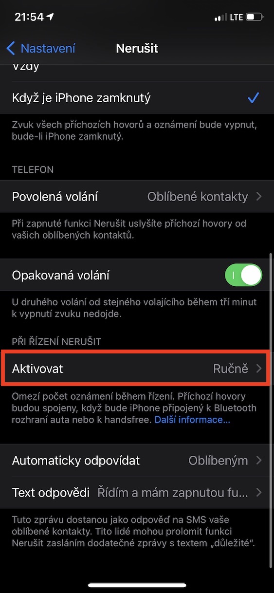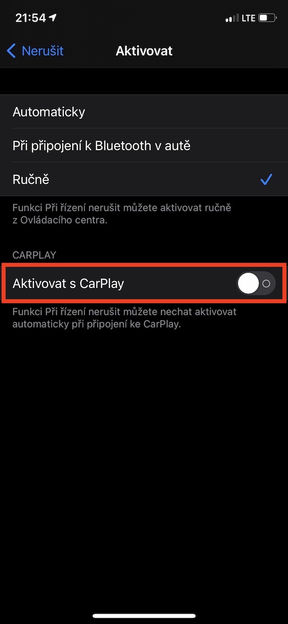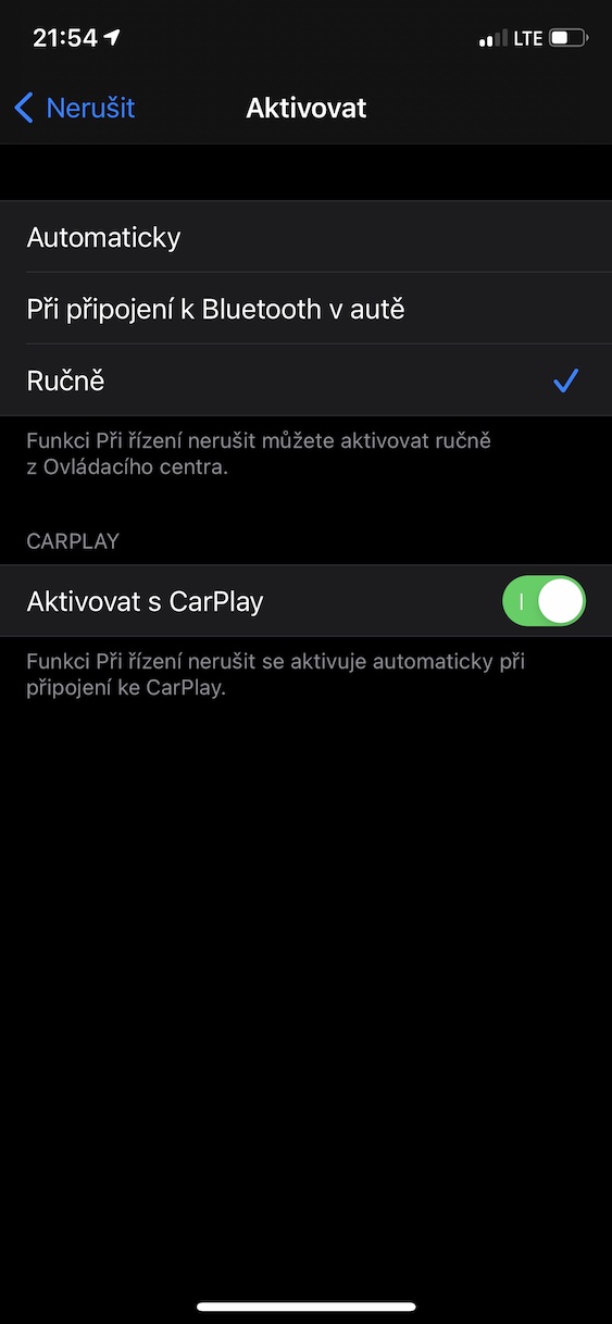 Součástí jablečného telefonu je mimo jiné režim Nerušit. Ten má většina z nás aktivní v noci, popřípadě v práci či ve škole. Po aktivaci režimu Nerušit dochází k tomu, že se automaticky ztiší veškeré notifikace a hovory, tedy pokud sami neurčíte jinak. Chytrým telefonem bychom však neměli být rušeni ani při řízení – mohlo by totiž například dojít ke způsobení nehody či k dalším problémům. I na tohle v Applu mysleli a do systému přidali speciální funkci s názvem Nerušit při řízení. Její aktivaci provedete v Nastavení -> Nerušit, kde sjeďte dolů a v kategorii Při řízení nerušit otevřete Aktivovat. Zde už stačí pomocí přepínače aktivovat možnost Aktivovat s CarPlay. Tento režim lze ovládat také v ovládacím centru, tedy pokud si do něj přidáte příslušný prvek.