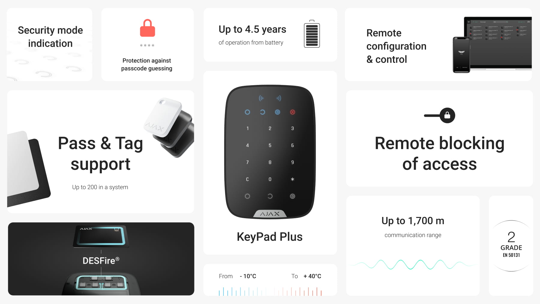 Aby byl celý bezpečnostní systém co možná nejjednodušší a flexibilní, Ajax představil nový bezdrátový KeyPad Plus. Ten tedy slouží pro správu zmiňovaného systému a využívat jej lze hned několika způsoby. Samozřejmě tím úplně základním je klasické „naťukání“ kódu prostřednictvím integrované klávesnice. Nechybí ale ani podpora pro bezkontaktní přístup prostřednictvím Ajax PassAjax Tag, které stačí pouze k zařízení přiložit. Potěšit dokáže i výdrž baterie, kterou díky tomu nemusíme každou chvíli měnit jako u konkurenčních řešení. Dokáže vydržet až 4 a půl roku. Celou správu KeyPadu pak lze samozřejmě řešit i dálkově. I tento produkt bude k dostání už letos v červnu.