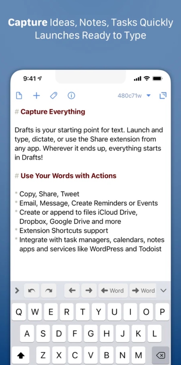 Aplikace s názvem Drafts skvěle poslouží k pořizování záznamů, zápisků, poznámek a připomínek všeho druhu. Ať už potřebujete zachytit momentální myšlenku, poznamenat si něco důležitého, zapsat část kódu nebo třeba rozepsat příspěvek na váš blog, Drafts vám bude vždy k dispozici. Své texty si navíc díky užitečným widgetům můžete kdykoliv a kdekoliv prohlédnout přímo na ploše vašeho iPhonu, aniž byste museli spouštět samotnou aplikaci.
