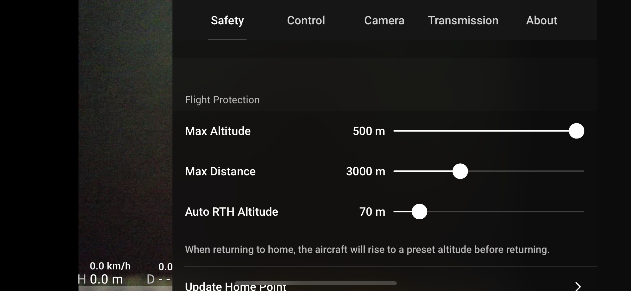 Možná vás napadá, co se stane v situaci, kdy dron z nějakého důvodu ztratí signál nebo mu nedej Bože dojde baterie. V druhém případě, kdy se baterie blíží vybití vám dron zahlásí upozornění pro bezpečný návrat, kdy vás vyzve abyste se buď sami vrátili nebo jste jej nechali se vrátit, protože ví, že pokud budete dále pokračovat v letu, hrozí, že se již nedokáže kvůli slabé baterii vrátit. Toto varování počítá i se sílou větru a dalšími vlivy a je dostatečně dopředu před tím, než by nastal skutečný problém s vybitím baterie. V případě, že ztratíte s dronem spojení, máte možnost nastavit tři možnosti, co se mají stát. Buď se dron zastaví ve vzduchu a vyčká nebo přistane. Třetí možnost je pak mnohem praktičtější a rozhodně ji doporučuji nastavit. Dron si totiž vždy díky GPS před odletem zapamatuje bod, ze kterého odstartoval. Pokud dojde ke ztrátě signálu, dron vystoupá do výšky, kterou jste předem nastavili, například 50 metrů, aby nehrozilo, že do čehokoli narazí a v této výšce se vrátí nad místo, ze kterého vystartoval a automaticky přistane.