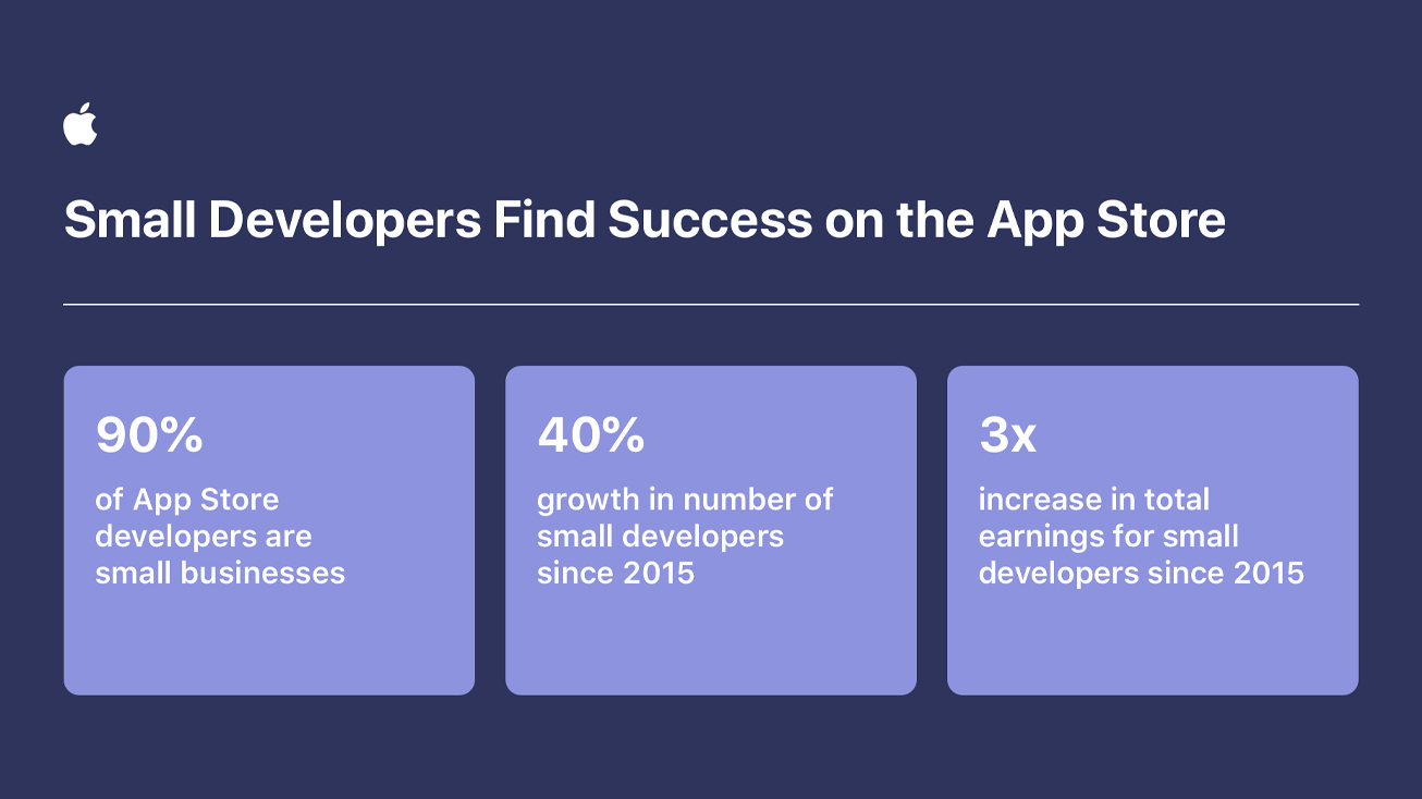 Kalifornský gigant v tiskové zprávě pracuje s daty, která poskytla společnost Analysis Group. Studie společnosti uvádí, že celosvětový počet tzv. „malých“ vývojářů se od roku 2015 doposud zvýšil o závratných 40 %. Pokud bychom tyto malé vývojáře měli zasadit do celkového počtu všech existujících vývojářů, tak zjistíme, že tato skupina zabírá majoritních 90 %. Abychom pojem malí vývojáři uvedli na pravdou míru, tak se jedná o takové vývojáře, kteří mají na svých aplikacích méně než 1 milion stažení, popřípadě kteří mají výdělek ze všech svých aplikací menší než 1 milion dolarů. Jen pro připomenutí, tato skupina vývojářů může využít výhodného programu App Store Small Business, díky kterému nemusí jablečné společnosti odvádět „desátek“ v podobě 30 % z celé transakce, ale jen 15 %.
