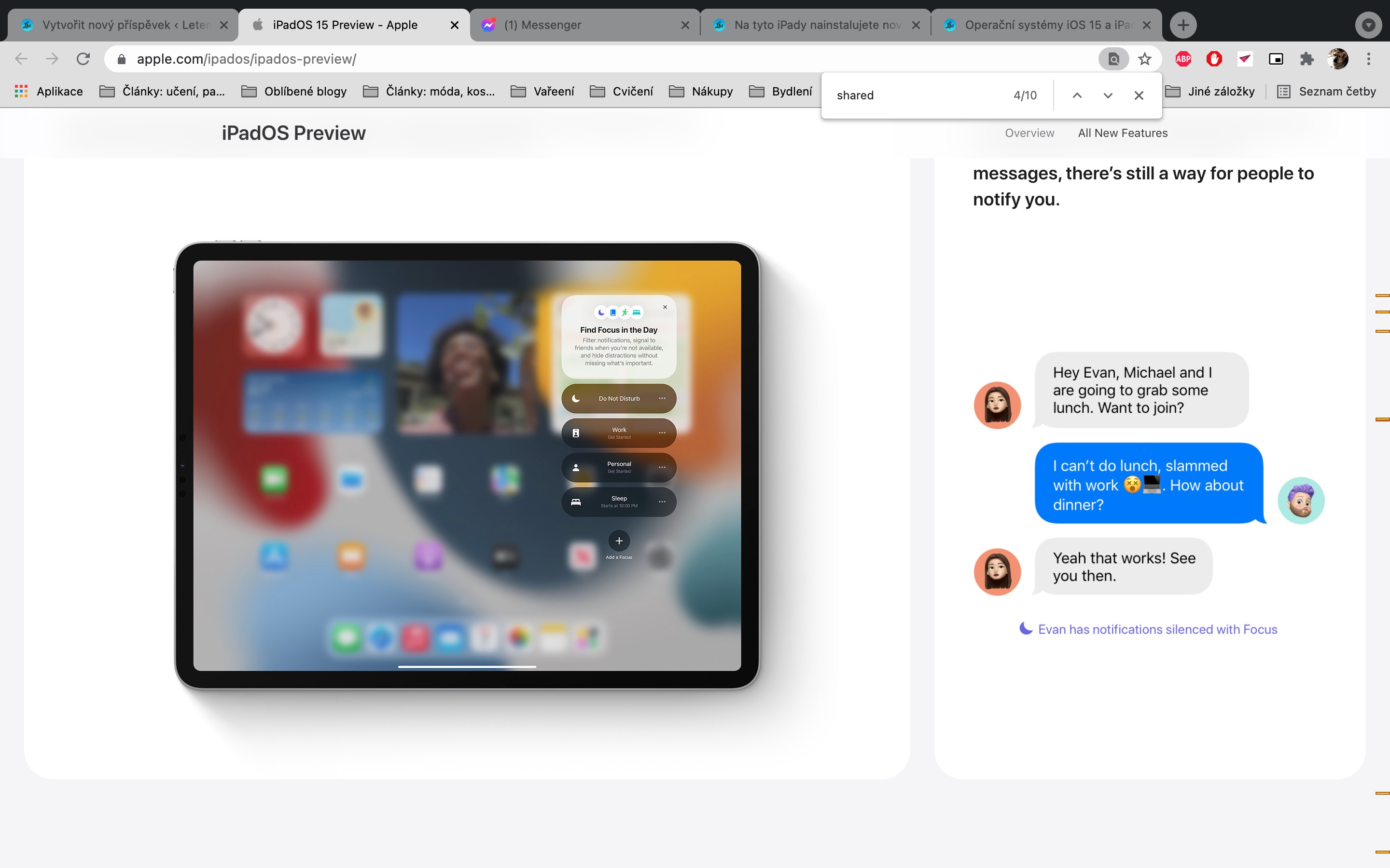 Pokud používáte iPad nejen k zábavě a komunikaci, ale také k práci, bude se vám určitě hodit novinka v podobě funkce s názvem Soustředění. V rámci této funkce můžete zvolit, na co právě v danou chvíli potřebujete soustředit, a vytvořit si podmínky pro notifikace, které budete v rámci aktivovaného Soustředění dostávat. Kamarádi nebo blízcí, kteří vám při aktivovaném Soustředění budou psát, se dozví, že máte danou funkci zapnutou, a budou díky tomu vědět, proč se jim právě v danou chvíli neozýváte.