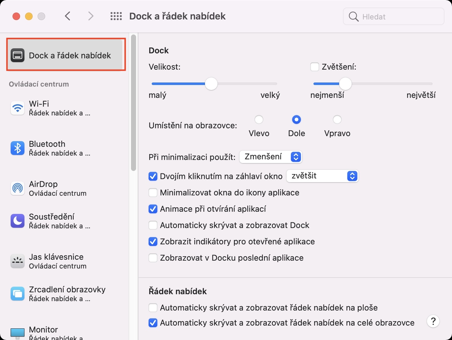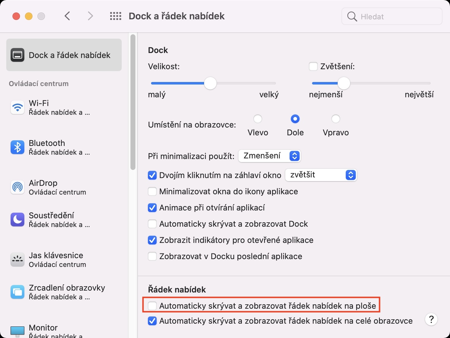 - Dále se přesvědčte, že se v levém menu nacházíte v záložce Dock a řádek nabídek.
