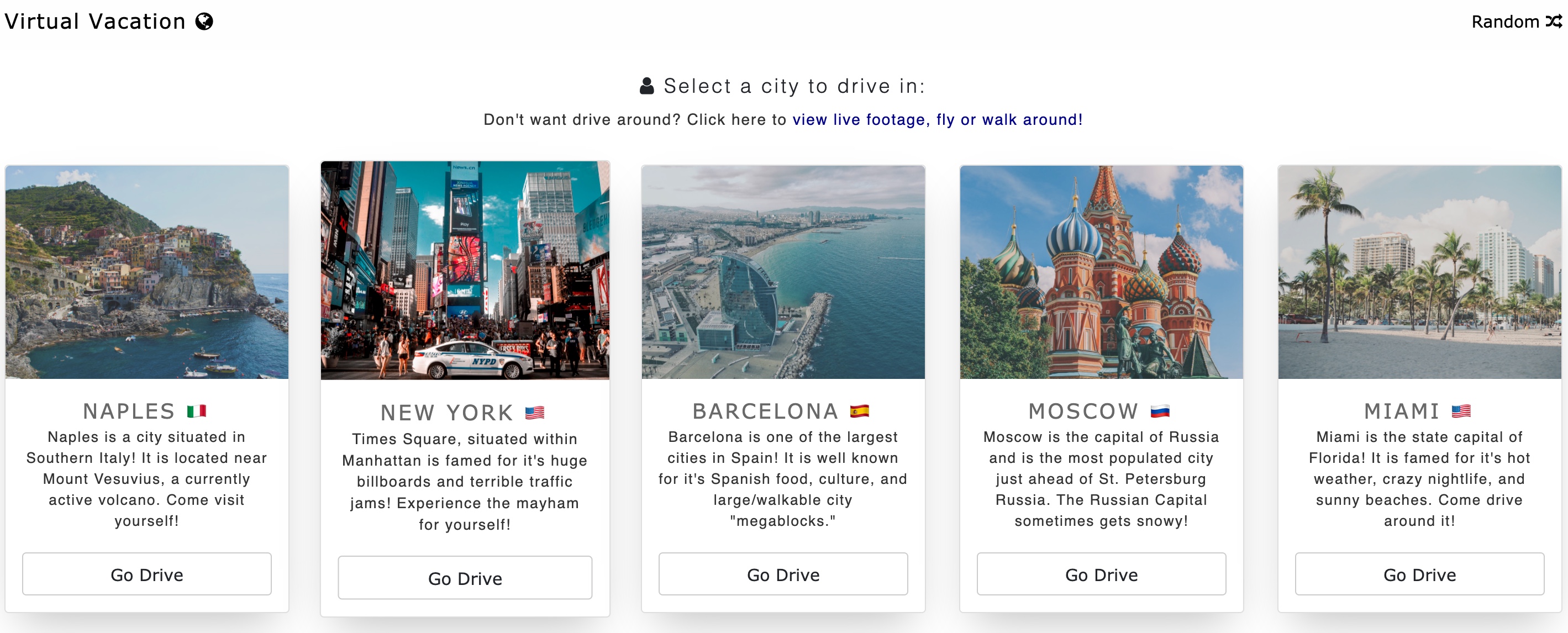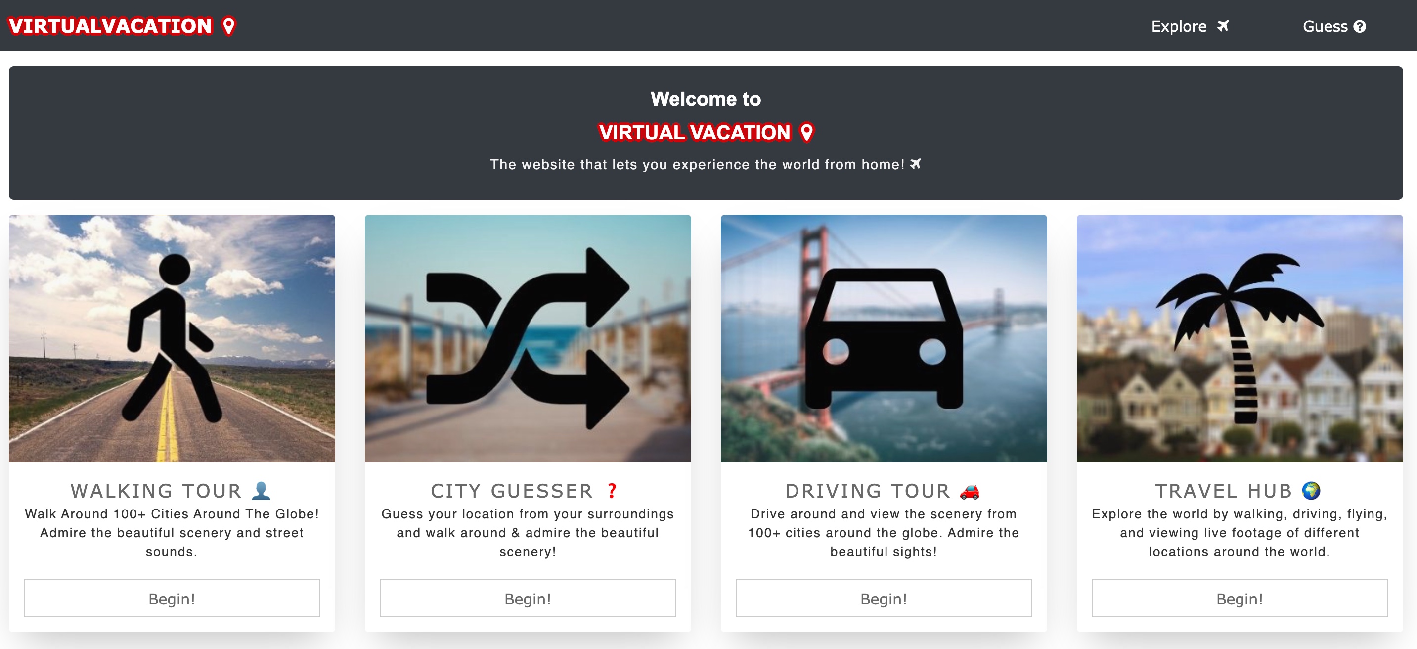 Nemůžete se dočkat dovolené, ale z jakýchkoliv důvodů se na ni zrovna nedostanete? Procházky po cizích městech ve všech možných koutech světa vám alespoň virtuálně dokáže zprostředkovat webová stránka VirtualVacation.us. Můžete zde absolvovat virtuální procházku po některé z turistických lokalit, ale také zkusit například uhodnout destinaci, prohlédnout si záběry z webových kamer po celém světě, nebo si třeba prohlédnout některé ze známých i méně známých světových památek. Stránka nabízí také virtuální projížďky vybranými městy nebo třeba vyhlídkové lety.