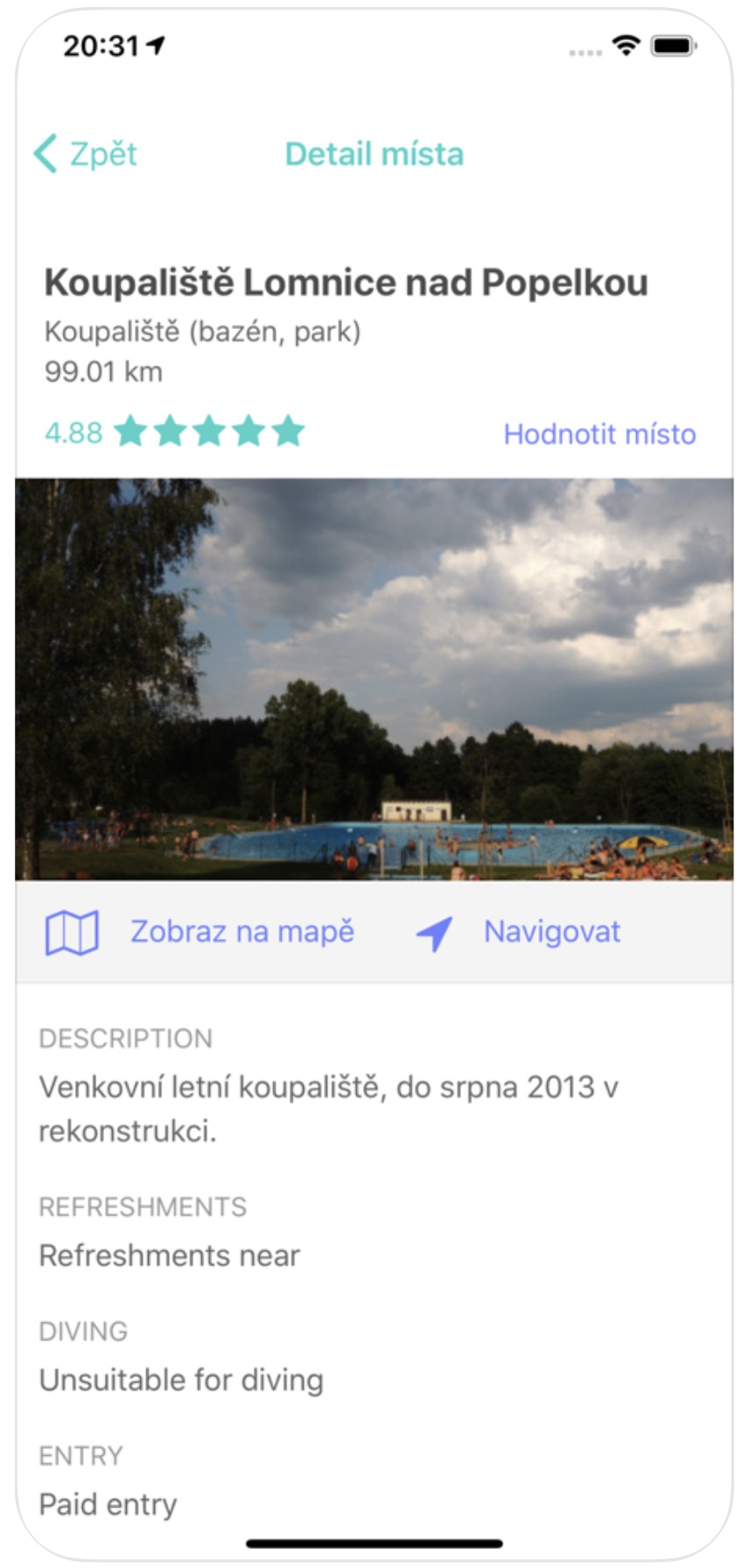 Super je dle mého názoru i to, že lze jednotlivé lokality recenzovat a to samozřejmě přímo v aplikaci. Díky tomu si tak uděláte dobrý obrázek o tom, zda stojí za návštěvu či zda je lepší raději popojet o pár kilometrů dál, kde je koupání ohodnoceno daleko větším počtem hvězd. Mimochodem, koupací lokality si můžete prohlédnout i na fotkách, které do aplikace přidávají samotní uživatelé. Všude je však bohužel nenaleznete, což je vcelku škoda.