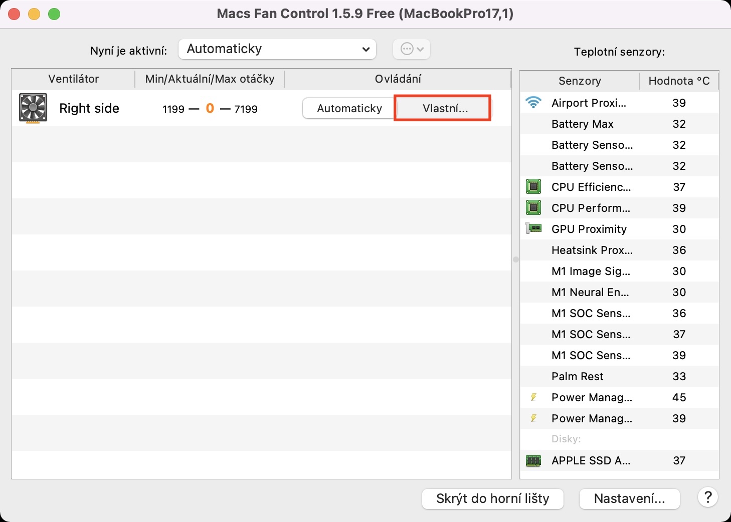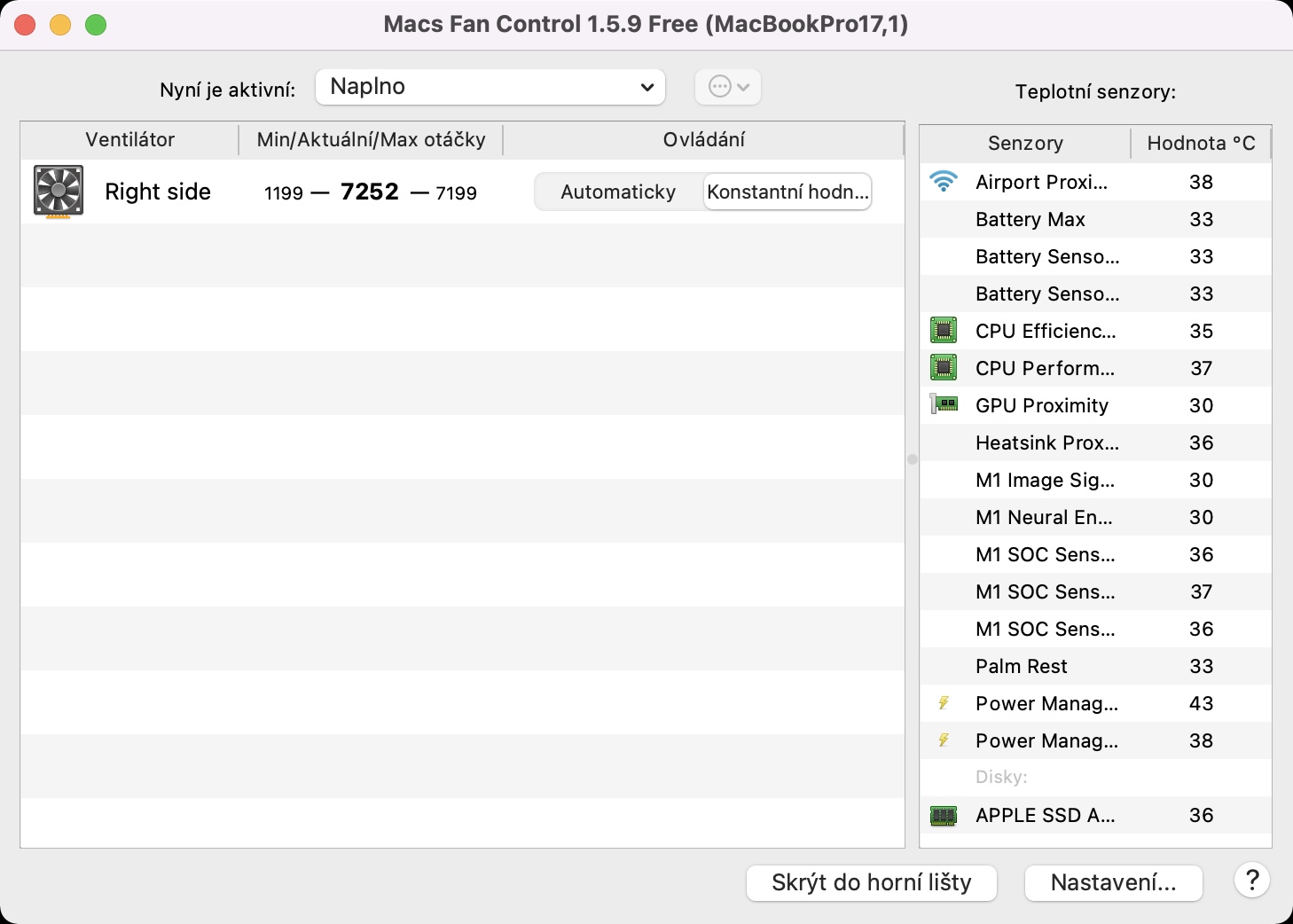 Pomocí výše uvedeného postupu lze tedy na vašem Macu zvýšit otáčky ventilátoru a pomoci mu k tomu, aby se lépe ochladil. Stejným způsobem můžete samozřejmě provést také snížení otáček, například v zimě, berte ale v potaz, že může dojít k přehřátí a vypnutí Macu. V takovém případě je ideální v rámci Macs Fan Control sledovat teploty, popřípadě si přidat do horní lišty informace o teplotě. Pro návrat zpět do automatického režimu stačí v okně u ventilátoru stisknout Automaticky. Macs Fan Control už nějakou dobu funguje i na Macy s čipy Apple Silicon. Nutno podotknout, že MacBook Air M1 ventilátor nemá, tudíž není možné jeho otáčky měnit. V Macs Fan Control si můžete nastavit také různé režimy a mnoho dalšího – pokud tedy máte čas, rozhodně aplikaci probádejte více.