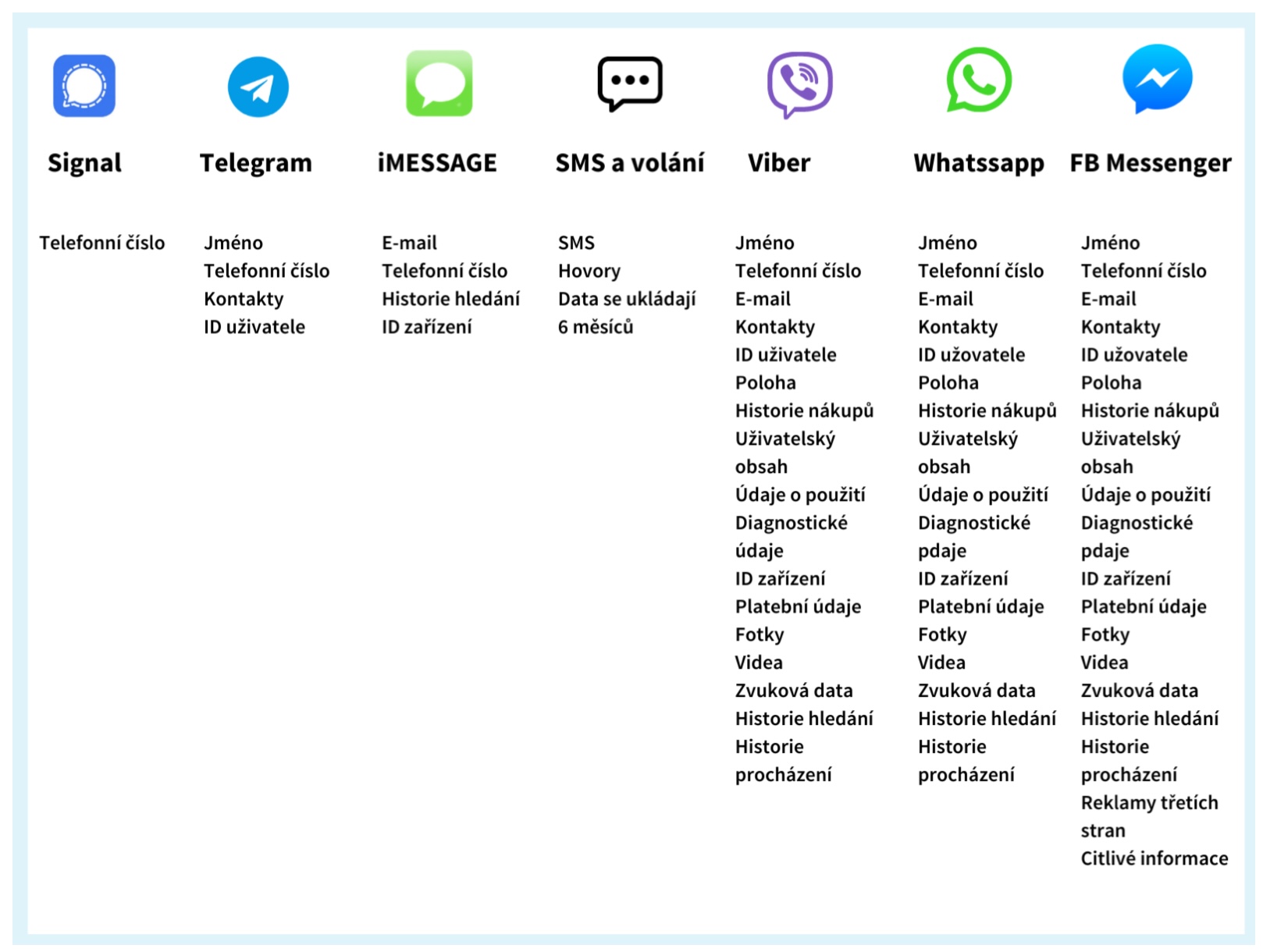 Jak je z tabulky jasně patrné, Viber, WhatsApp a Facebook Messenger toho o nás shromažďují mnoho. Pro někoho tolik, že od těchto sítí dali ruce pryč. K enormnímu odlivu klientů došlo například od WhatsAppu poté, co ho Facebook koupil a upravil podmínky ochrany osobních dat.