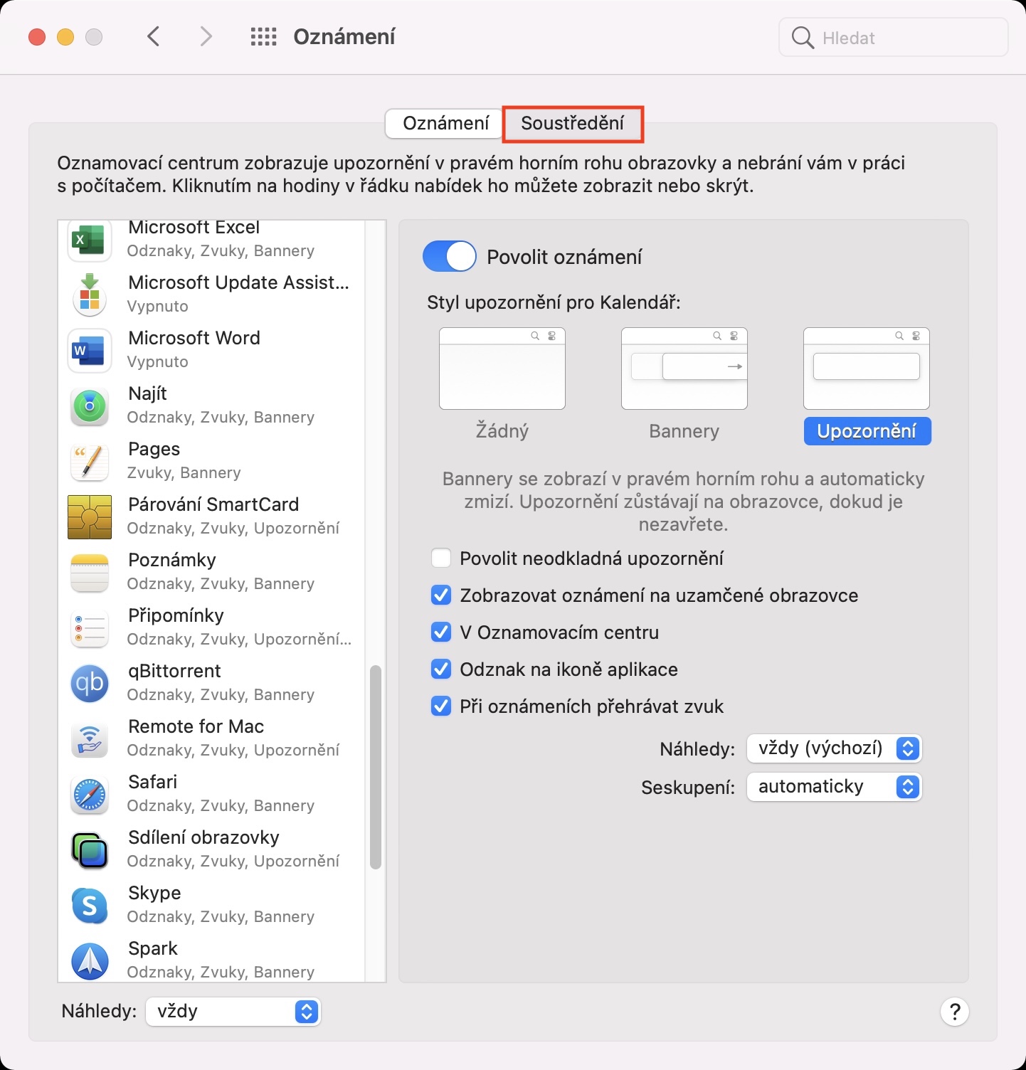 - Dále se v horní části okna přesuňte do záložky Soustředění.