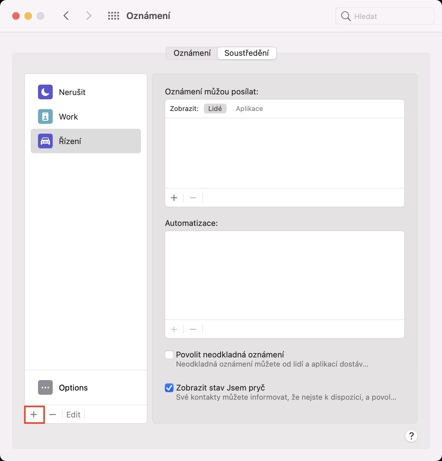 - Zde pak v levém dolním rohu klepněte na ikonu +, čímž dojde k otevření rozhraní pro vytvoření nového režimu.