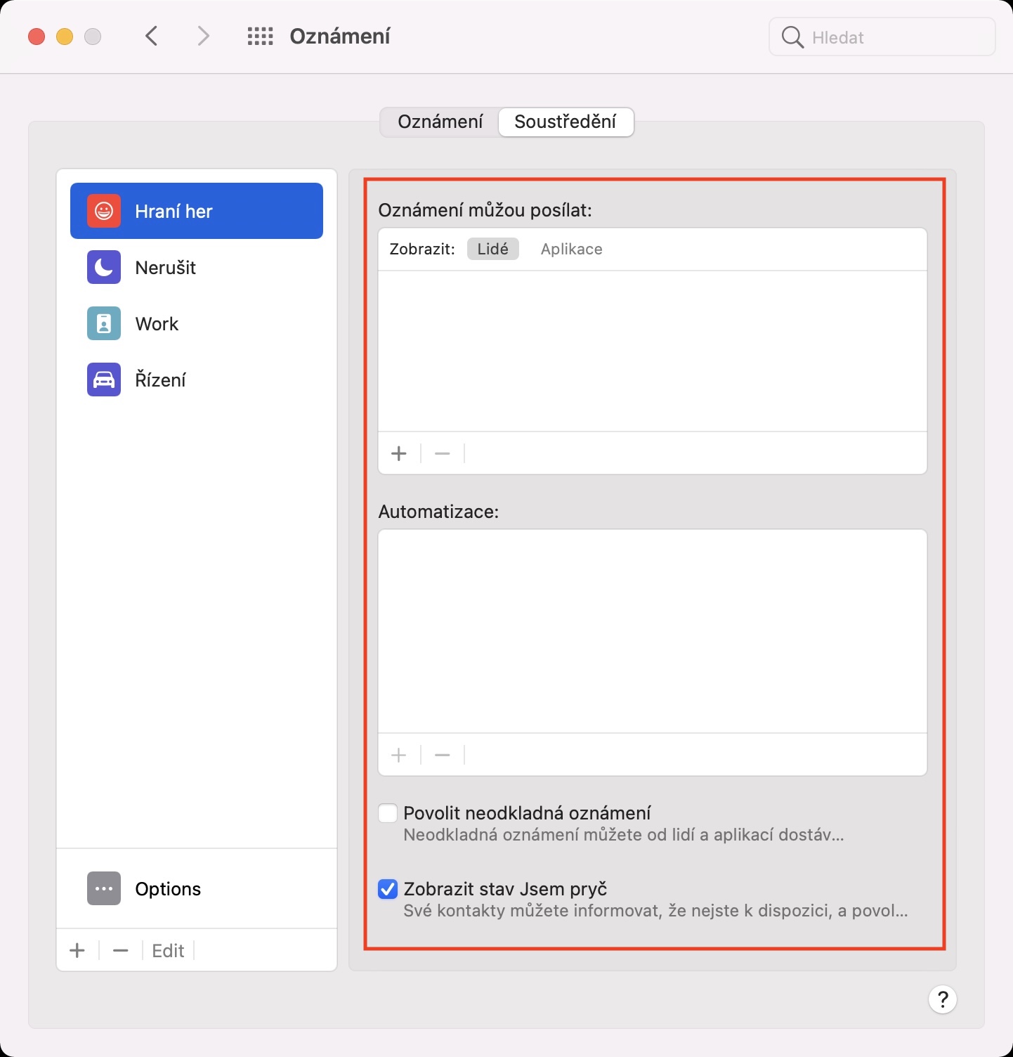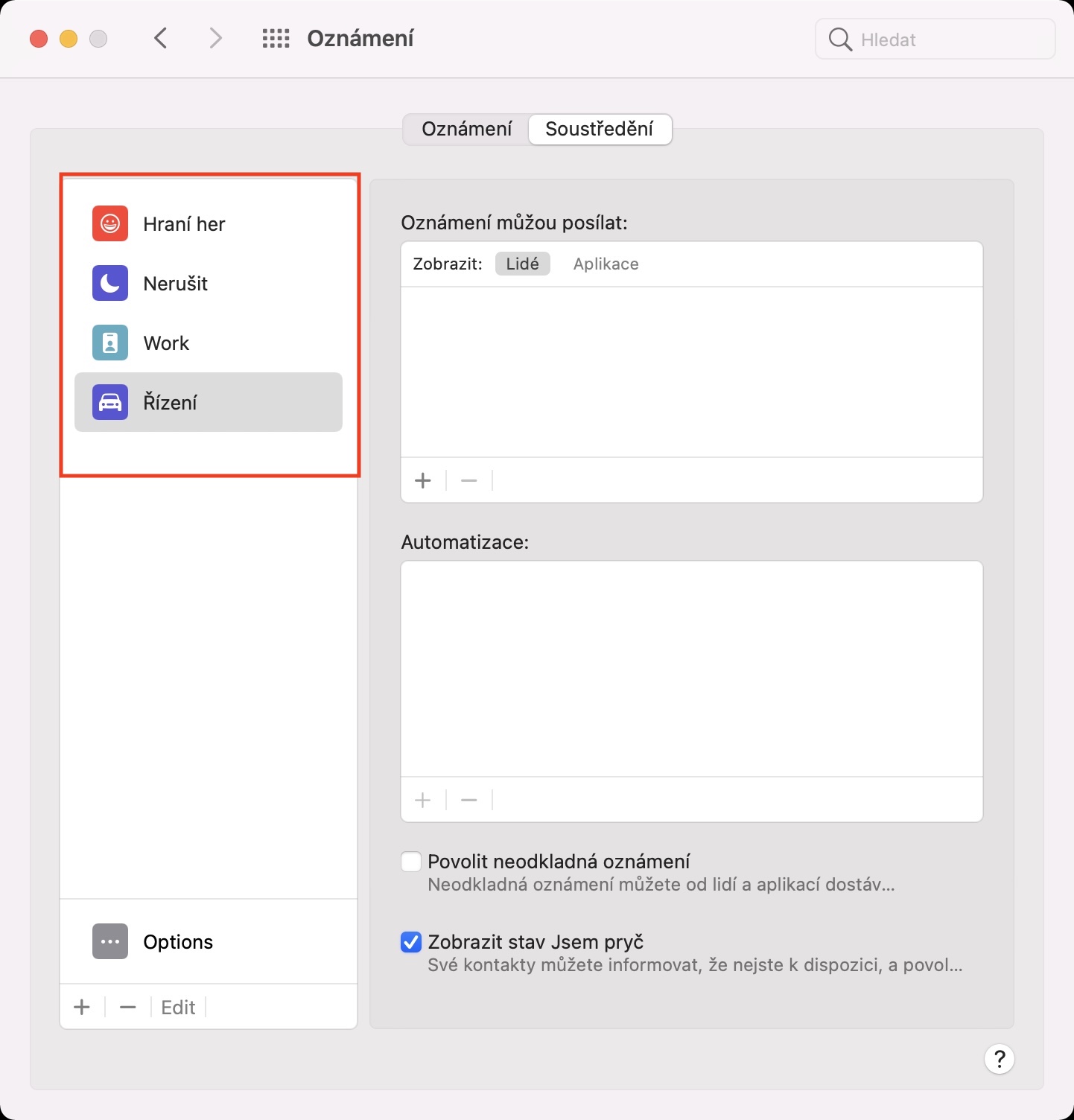 Pomocí výše uvedeného způsobu lze tedy na vašem Macu v macOS 12 Monterey vytvořit nový režim Soustředění. Tím to ale samozřejmě nekončí, jelikož je nutné, abyste si u jednotlivých režimů nastavili další podmínky. V bočním panelu si tedy rozklikněte režim Soustředění, který chcete upravit. Poté si napravo vyberte aplikace, které vám budou moci posílat oznámení, a lidi, kteří vás budou moci kontaktovat. Dále si můžete níže vytvořit automatizace (například pro automatické zapnutí režimu) a nechybí také možnost pro (ne)povolení neodkladných oznámení či zobrazení stavu Jsem pryč. Veškeré režimy Soustředění se nově synchronizují napříč všemi vašimi zařízeními. Jednak je tedy vždy jednoduše a kdekoliv najdete, a pokud režim Soustředění aktivujete na jednom zařízení, tak se automaticky aktivuje i na těch dalších.