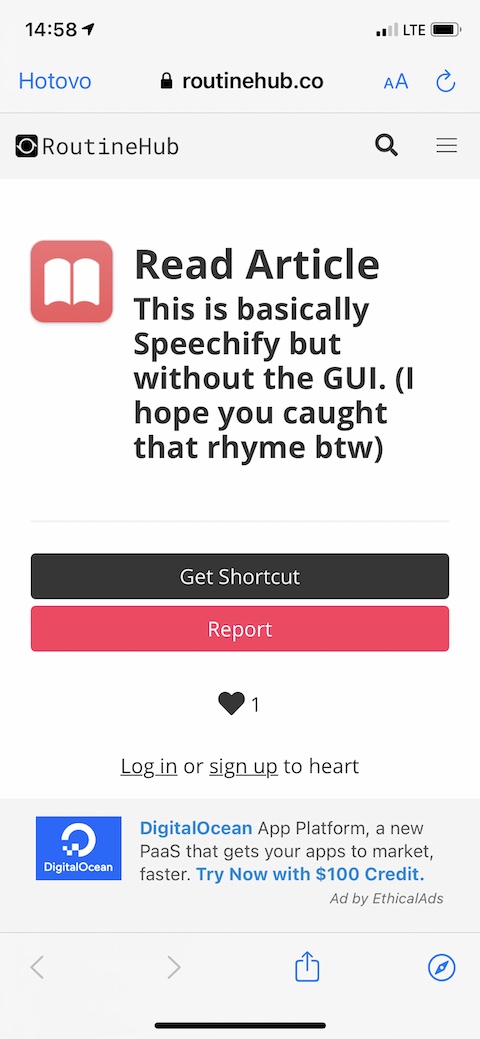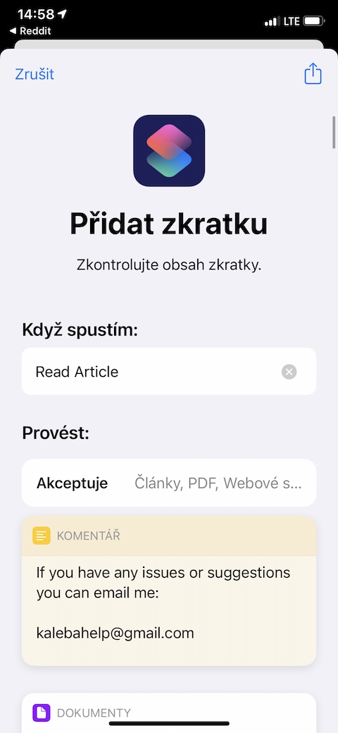 Read Article je velice zajímavá, užitečná a šikovná zkratka, která vám ve vámi zvoleném jazyce a vámi nastaveném hlase dokáže nahlas přečíst prakticky jakýkoliv text, ať už se jedná o webové stránky, nebo třeba o dokumenty ve formátu PDF. Zkratka funguje spolehlivě, nabízí i českou výslovnost a hlasy, a nabízí také funkci opravy výslovnosti.