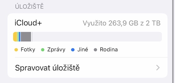 Hned na začátek je fajn si zjistit, jaká data vlastně úložiště na iCloudu nejvíce zabírají. Naštěstí se ale nejedná o nic složitého – můžete si totiž nechat zobrazit graf, ve kterém relativně jednoduše zjistíte, jaká kategorie dat na iCloudu zabírá nejvíce místa. Pro zobrazení grafu přejděte do Nastavení, kde nahoře rozklikněte váš profil, a poté kolonku iCloud. Jakmile tak učiníte, tak krátkou dobu vyčkejte, až se načtou veškeré informace. Konkrétně zde můžete zobrazit celkově čtyři kategorie – Fotky, Zprávy, Jiné a Rodina. Fotky a Zprávy jsou jasné, v Jiné se pak nachází data, která není možné rozdělit, a v Rodina pak data, která patří ostatním členům rodinného sdílení. Tento graf si můžete samozřejmě zobrazit také pro vaše interní úložiště na iPhonu (či iPadu), stačí přejít do Nastavení -> Obecné -> Úložiště: iPhone nebo Úložiště: iPad.
