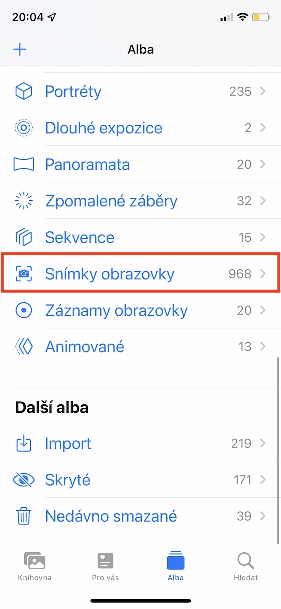 Využíváte Fotky na iCloudu? Pokud jste si na tuto otázku odpověděli kladně, tak mi dáte za pravdu když řeknu, že se jedná o data, která zabírají na iCloudu nejvíce místa. Jedna fotografie má totiž v dnešní době hned několik megabajtů a v případě, že využíváte Live Photo, tak se velikost ještě mnohonásobně zvětší. O fotografie ale nechce přijít nikdo z nás a navíc, co si budeme nalhávat, nikomu z nás se v dnešní době nechce připojovat kabel a ručně veškeré fotografie pravidelně zálohovat. iCloud zvládne udělat vše za vás a vy se nemusíte o nic starat. Každopádně je nutné brát v potaz, že iCloud zálohuje veškeré fotografie. Tedy i například nepotřebné snímky obrazovky a další fotografie či obrázky, které vůbec nepotřebujeme. Pokud je chcete z iCloudu smazat, tak stačí, abyste je klasicky smazali v aplikaci Fotky. Snímky obrazovky jednoduše zobrazíte v sekci Alba, kde níže najděte Typ médií, a poté zde klepněte na Snímky obrazovky (či na cokoliv jiného).