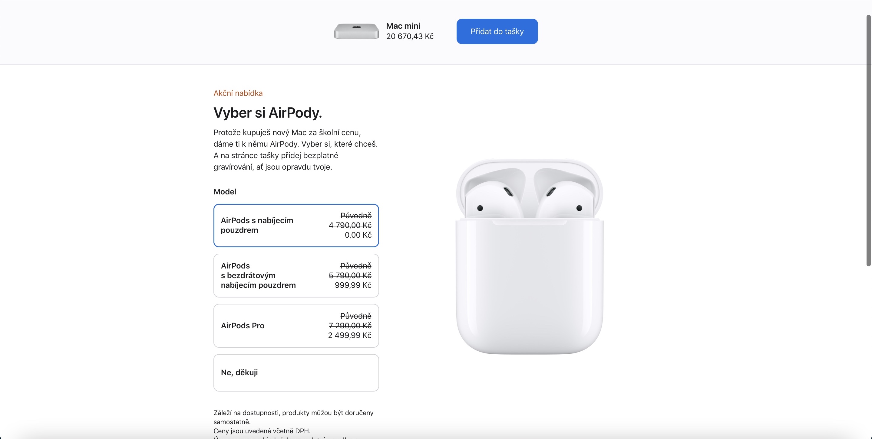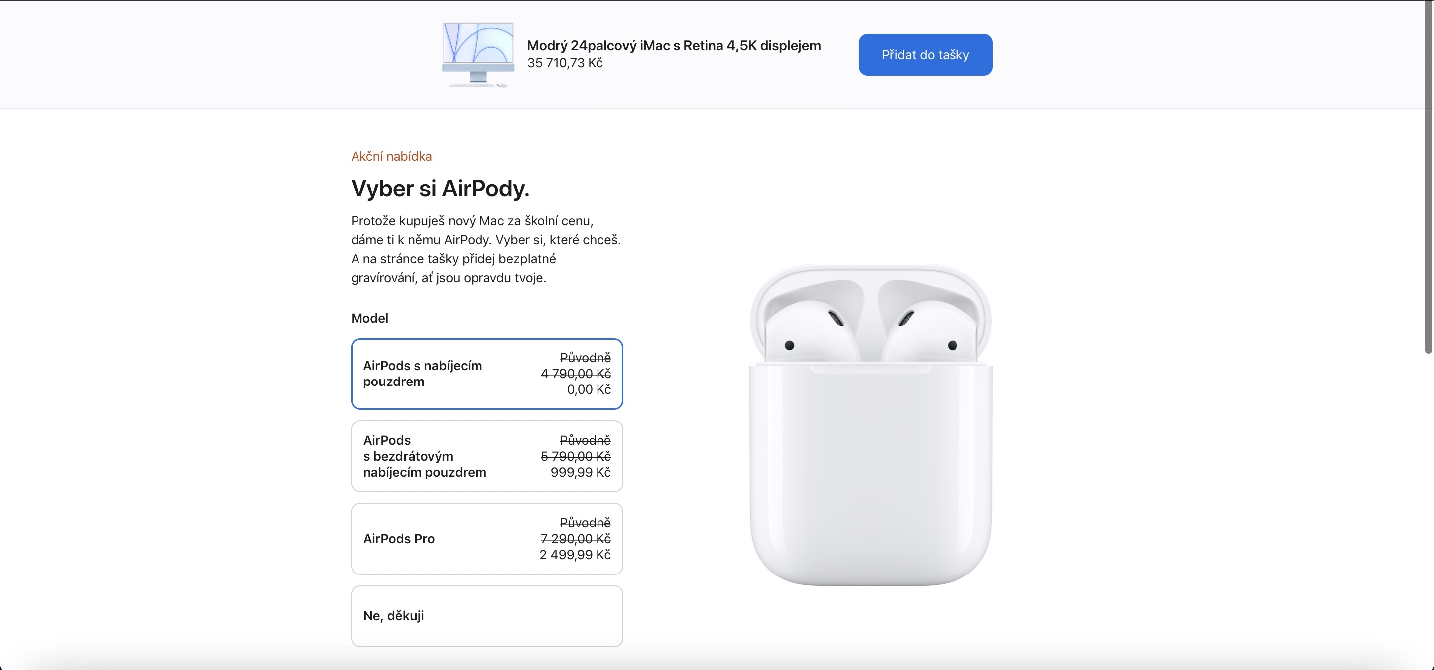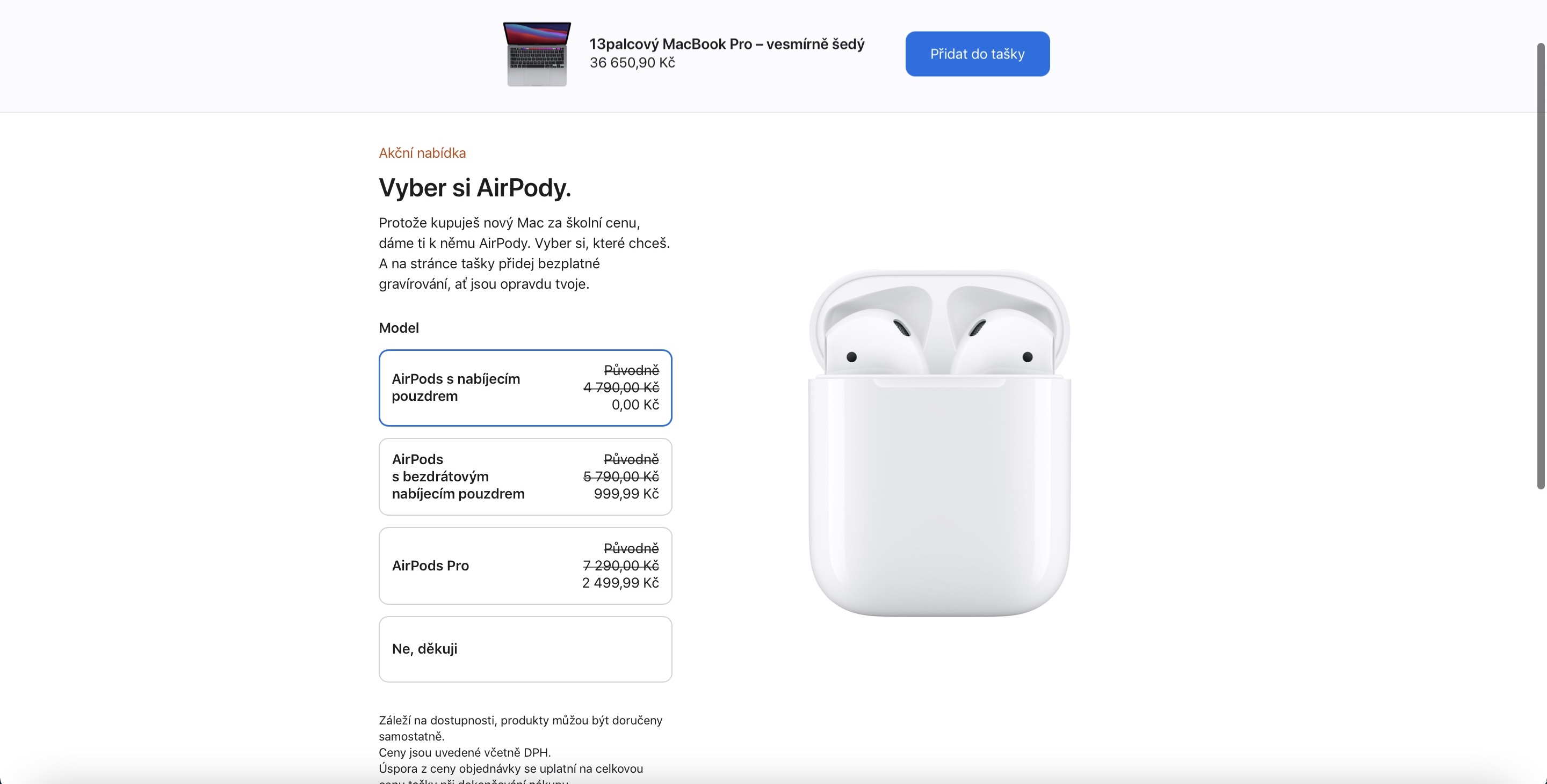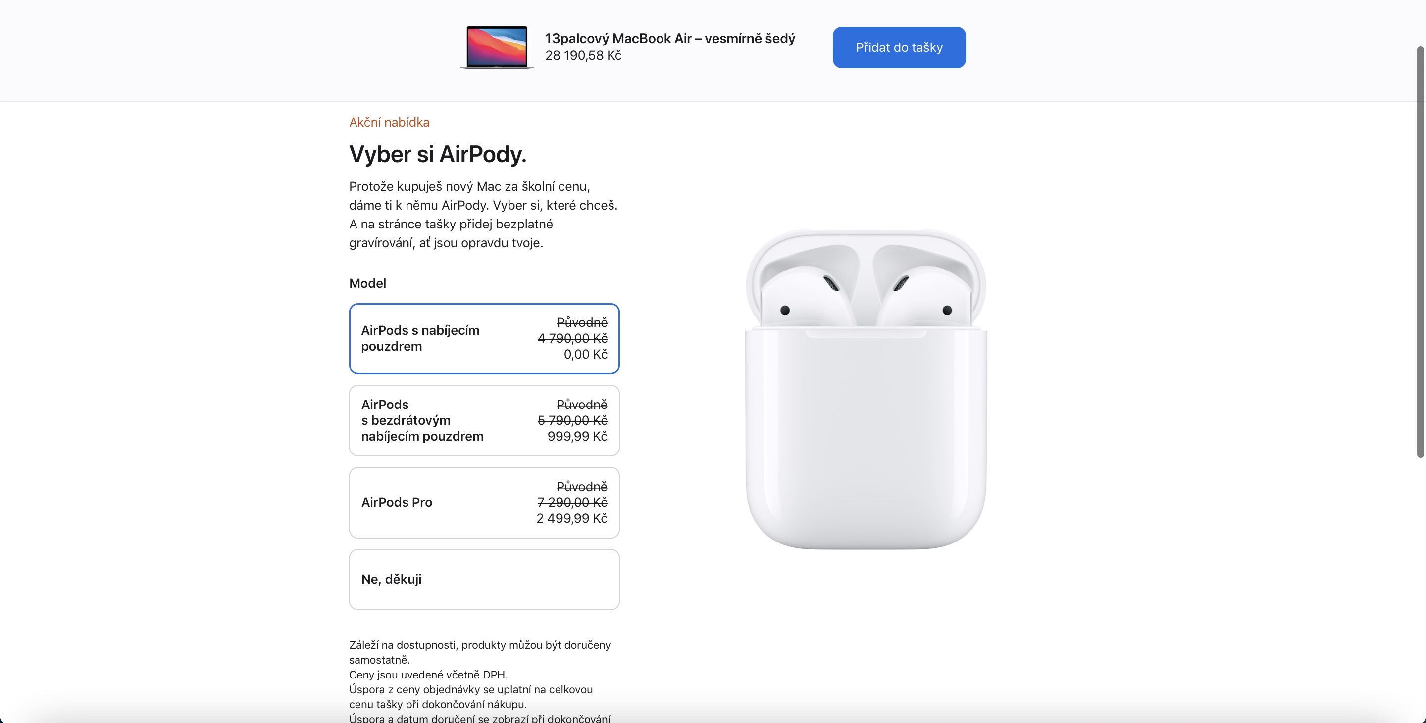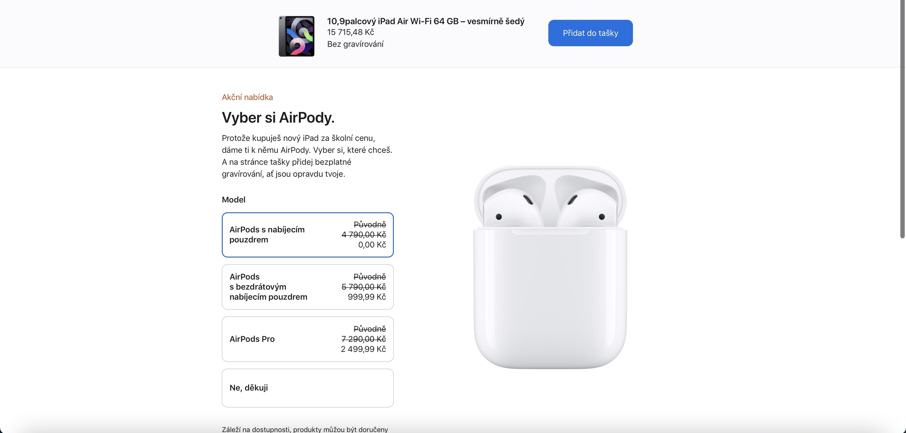 Zatímco v minulých letech rozdával Apple k iPadům a Macům sluchátka z dílny Beats, od loňska se rozhodl přesedlat na AirPods a to dokonce všechny varianty, které prodává. Získat k produktům tedy můžete jak klasické AirPods s nabíjecím pouzdrem, tak i AirPods s bezdrátovým nabíjecím pouzdrem či AirPods Pro. Poslední dva zmiňované produkty sice od Applu nezískáte zdarma, nýbrž se slevou, ale i tak se nad nimi vyplatí přemýšlet. Sleva je totiž skutečně velká – při výběru AIrPods s bezdrátovým nabíjecím pouzdrem totiž doplatíte Applu jen 999 korun a v případě AirPdos Pro jen 2499 korun. Poměrně zajímavé přitom je, že se sleva v závislosti na ceně kupovaného iPadu či Macu nemění. Stejný doplatek si tedy užijete jak při koupi iPadu Air, tak iMacu Pro.