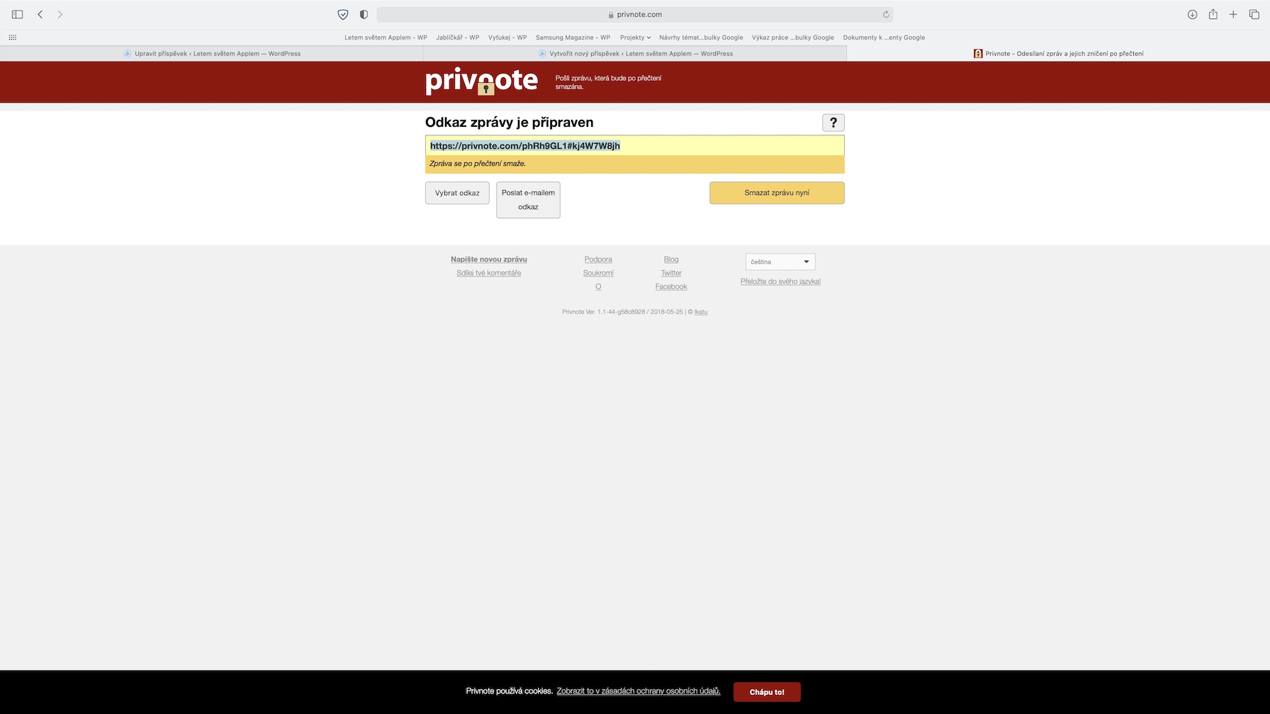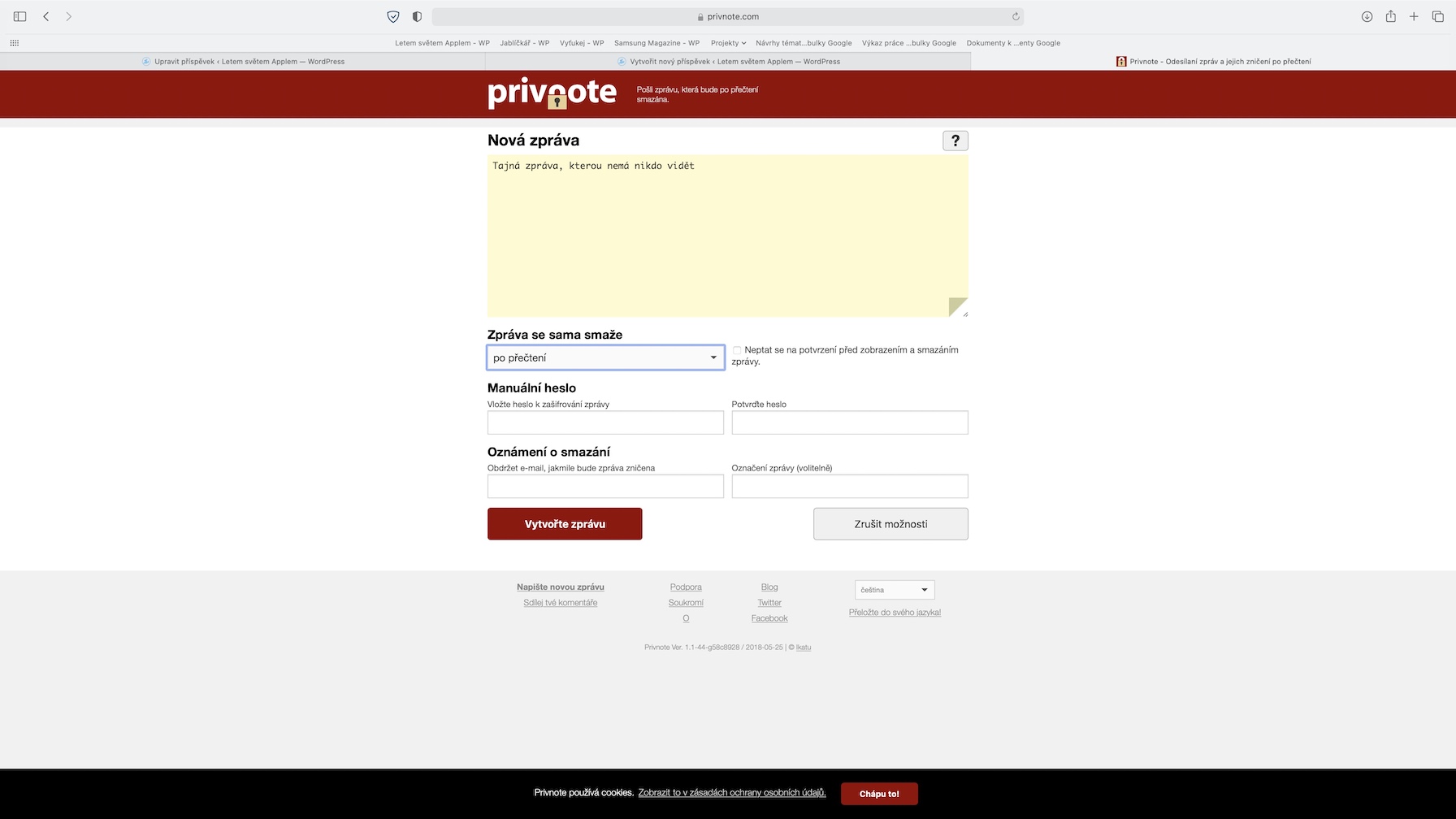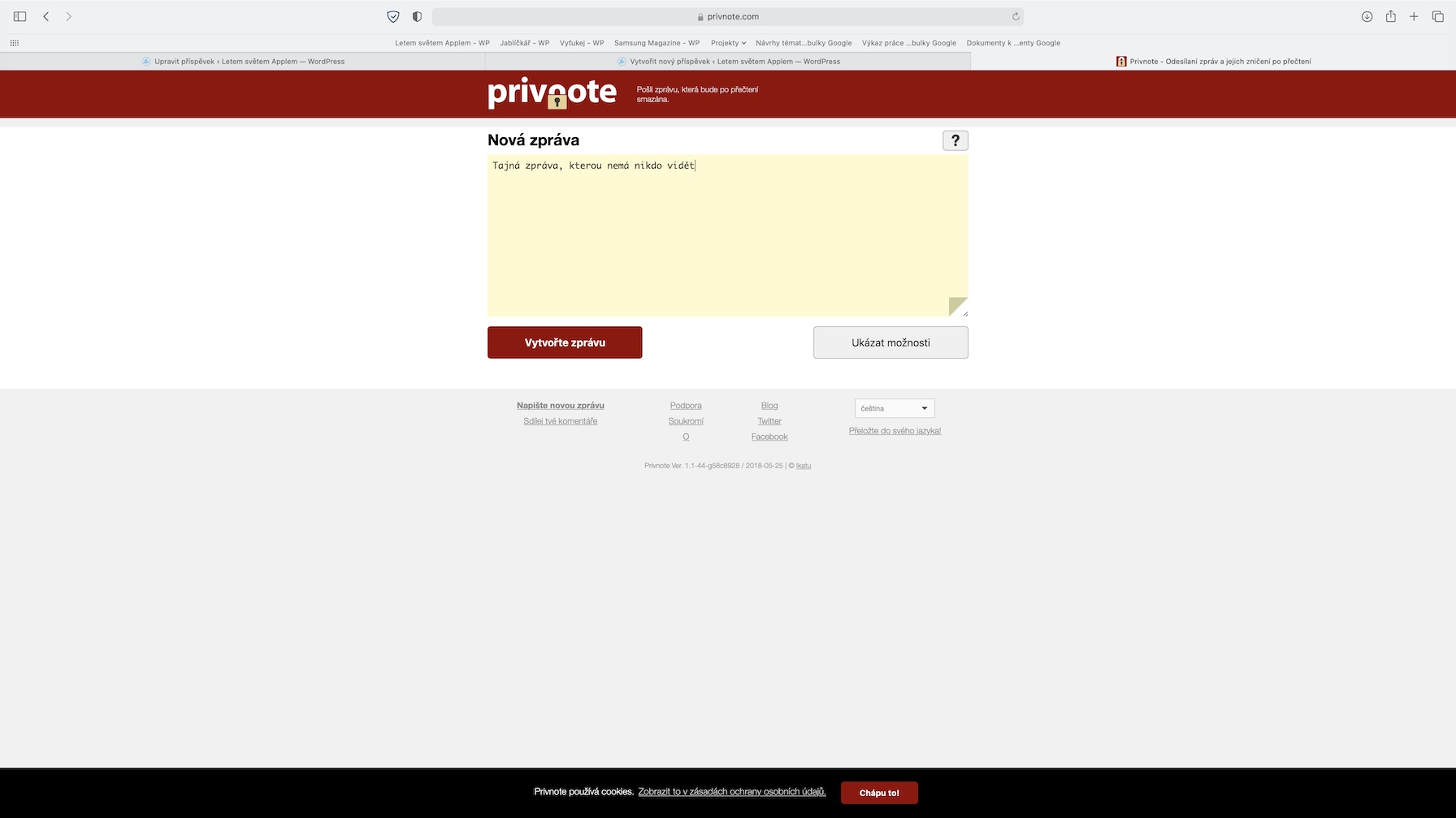 Pro zaznamenávání poznámek lze na Apple zařízeních využít nativní aplikaci Poznámky. Co ale dělat, pokud někomu potřebujete zaslat důležitou poznámku, o které se nesmí nikdo jiný dozvědět? Takové situace mohou nastat v několika různých případech – a pro všechny z nich je tady webová stránky Privnote. Pomocí této webové stránky můžete vytvořit klasickou poznámku, kterou poté můžete zaslat druhé straně. Ta poznámku otevře klasickým způsobem na internetu. Jakmile však dojde jednou k otevření poznámky, tak už se k ní nikdy nikdo nedostane. U každé poznámky si můžete nastavit, kdy ke zničení dojde, pro větší bezpečnost lze nastavit i heslo. Můžete si také nechat poslat e-mail, který potvrdí, že poznámka byla zničena.