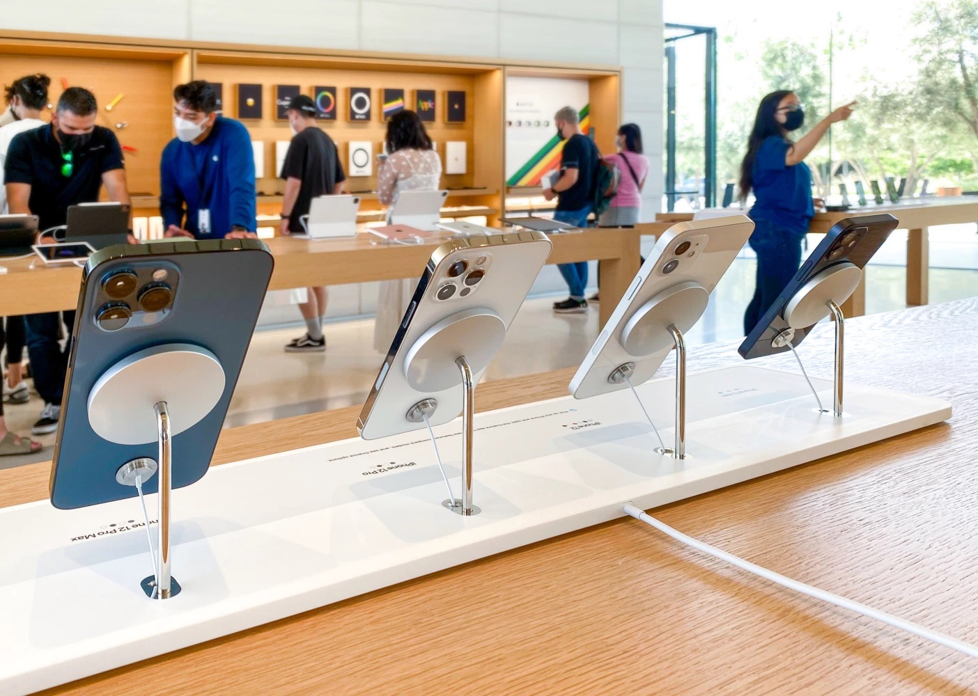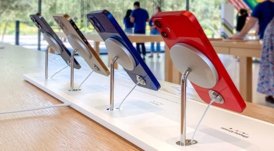 Stejně jako designy jablečných kamenných obchodů musí být i prezentace produktů něčím výjimečná. Apple tak vyvinul pro své prodejny nový způsob propagace iPhonů, které zdůrazňuje bezdrátové nabíjení za pomoci MagSafe, eliminuje množství kabelů po stole a činí iPhony zákazníkům přístupnější.