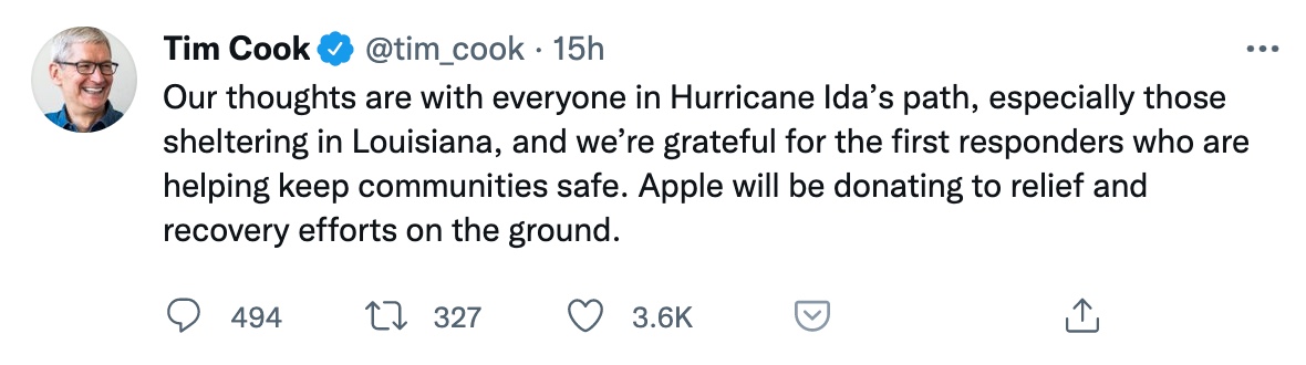 Tim Cook zveřejnil nedávno na svém twitterovém účtu příspěvek, ve kterém vyjádřil svou podporu všem, kteří byli hurikánem Ida jakýmkoliv způsobem zasaženi. „V našich myšlenkách jsme se všemi, kteří stáli v cestě hurikánu Ida, a obzvláště s těmi, kteří se nyní ukrývají v Louisianě. Jsme vděční všem složkám, jejichž členové pomáhají zajišťovat bezpečí komunit,“ uvedl Cook ve svém tweetu. Výši finančního příspěvku zatím nijak nespecifikoval, a v době psaní tohoto článku zatím nebylo jisté ani to, jakou podobu a rozsah bude podpora ze strany Applu mít, ani ke komu má konkrétně zamířit. U Applu není nijak neobvyklé, že finančně pomáhá s likvidací následků nejrůznějších (nejen) přírodních katastrof. V průběhu druhé poloviny tohoto července například cupertinská společnost finančně pomohla oblastem, které byly zasažené záplavami. Firma se ale věnuje i dlouhodobé charitě, například prostřednictvím prodeje výrobků řady (PRODUCT) RED, a angažoval se například také v boji s pandemií koronaviru.