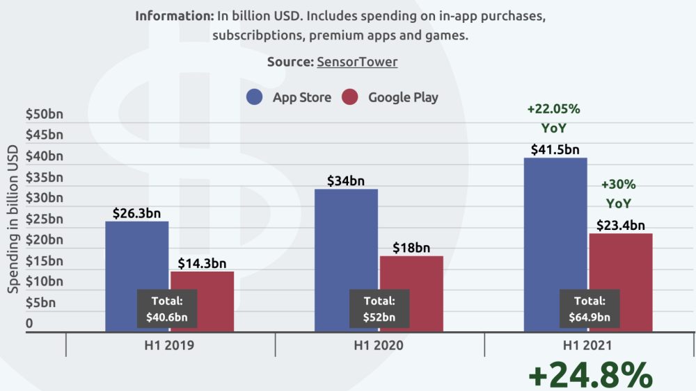 Uživatelé Androidu utratili v Google Play 23,4 miliard. Výdaje za App Store v prvním pololetí 2021 představují růst o 22,05% oproti podobnému období roku 2020. Celkově výdaje na obou platformách zaznamenaly růst o 24,8%, meziročně dosáhly celkem 64,9 miliardy amerických dolarů.