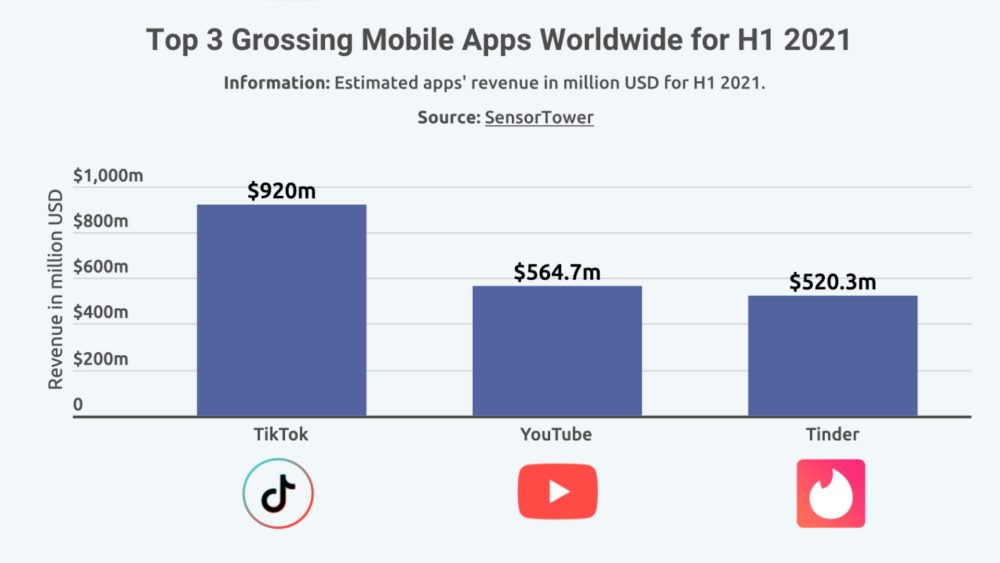 Platforma pro vytváření a sdílení krátkých zábavných videí TikTok se v první polovině roku 2021 stala dle dat společnosti SensorTower nejziskovější aplikací s 920 miliony amerických dolarů. Se ziskem 564,5 milionů amerických dolarů následuje Youtube, na třetím místě je Tinder s 520,3 miliony dolarů.