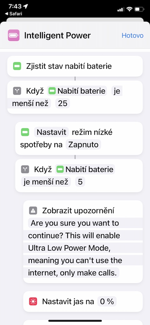 Zkratku Intelligent Power můžete skvěle využít, když budete na vašem iPhonu chtít aktivovat režim snížené spotřeby baterie. Při aktivaci této zkratky provede váš iPhone řadu akcí, jako je vypnutí síťového připojení, snížení jasu na nulu, nebo třeba deaktivace mobilních dat, díky čemuž můžete v případě nouze uspořit pár procent vaší baterie. Zkratku si v jejím nastavení můžete také přizpůsobit.