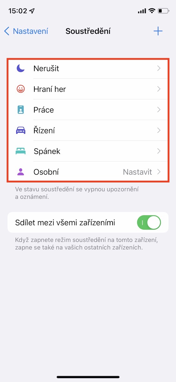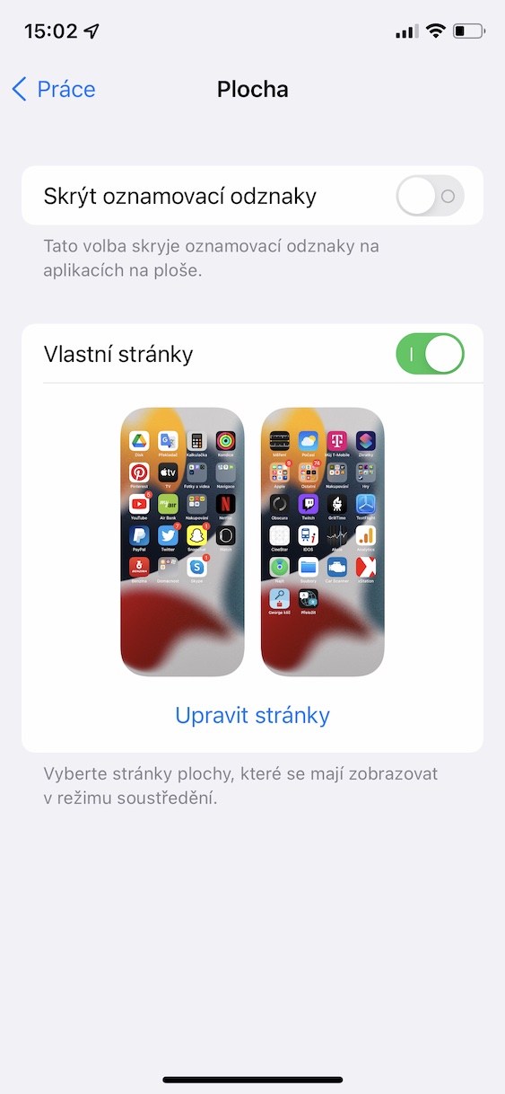 Součástí iOS 15, ale také iPadOS 15 a macOS 12 Monterey, je nový režim Soustředění. Ten lze jednoduše definovat jakožto původní režim Nerušit na steroidech. V rámci Soustředění si můžete individuálně nastavit hned několik režimů – jeden například do práce, druhý pro hraní her a třetí na domácí pohodu. Nastavit si můžete například to, jaké aplikace vám budou moci posílat oznámení, popřípadě který z kontaktů se vám bude moci dovolat. Pokud budete mít Soustředění aktivní, tak se ve Zprávách druhé straně o této skutečnosti bude zobrazovat upozornění. Kromě toho si u režimů můžete nastavit také individuální zobrazení domovských stránek, potažmo které aplikace se vám zobrazí. Nastavit tuto možnost můžete v Nastavení -> Soustředění -> režim -> Plocha -> Vlastní stránky.
