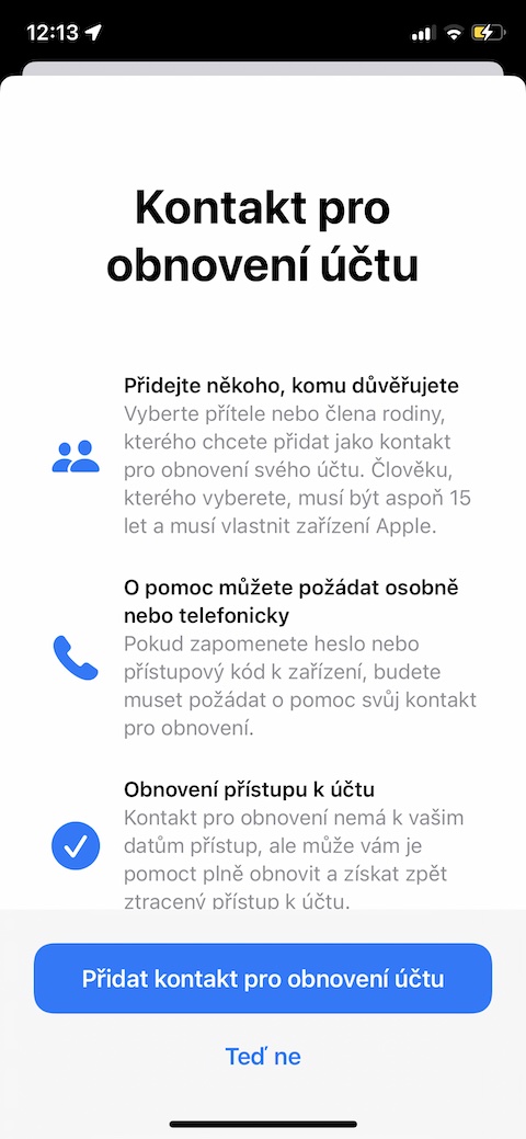 Pokud zapomenete přihlašovací údaje ke svému Apple ID účtu, není to v žádném případě jednoduchá situace. Apple naštěstí v operačním systému iOS 15 zavádí možnost přidání kontaktů pro obnovení účtu. Na svém iPhonu spusťte Nastavení -> Panel s vaším jménem -> Heslo a zabezpečení. Klepněte na Obnovení účtu -> Přidat kontakt pro obnovení.