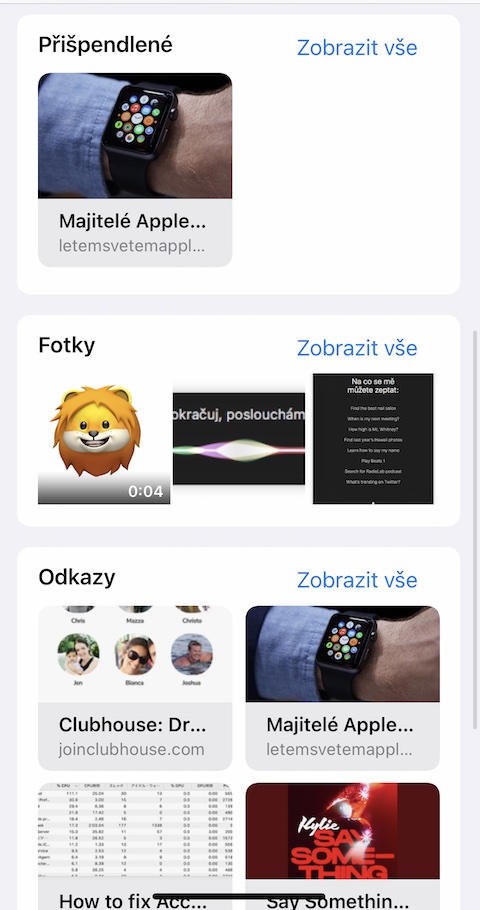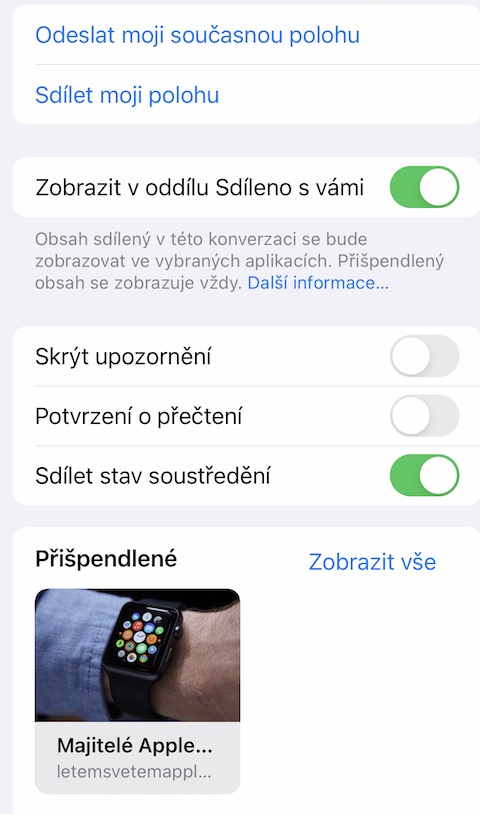 V operačním systému iOS 15 je také mnohem jednodušší prohlédnout si obsah, který s vámi ostatní uživatelé sdíleli ve zprávách, a také na něj reagovat. Pokud v horní části displeje vašeho iPhonu v nativních Zprávách klepnete na profil dotyčného, najdete v kartě možnost aktivace zobrazení Sdíleno s vámi. Pokud tuto možnost aktivujete, zobrazí se obsah, sdílený v dané konverzaci, ve vybraných aplikacích.
