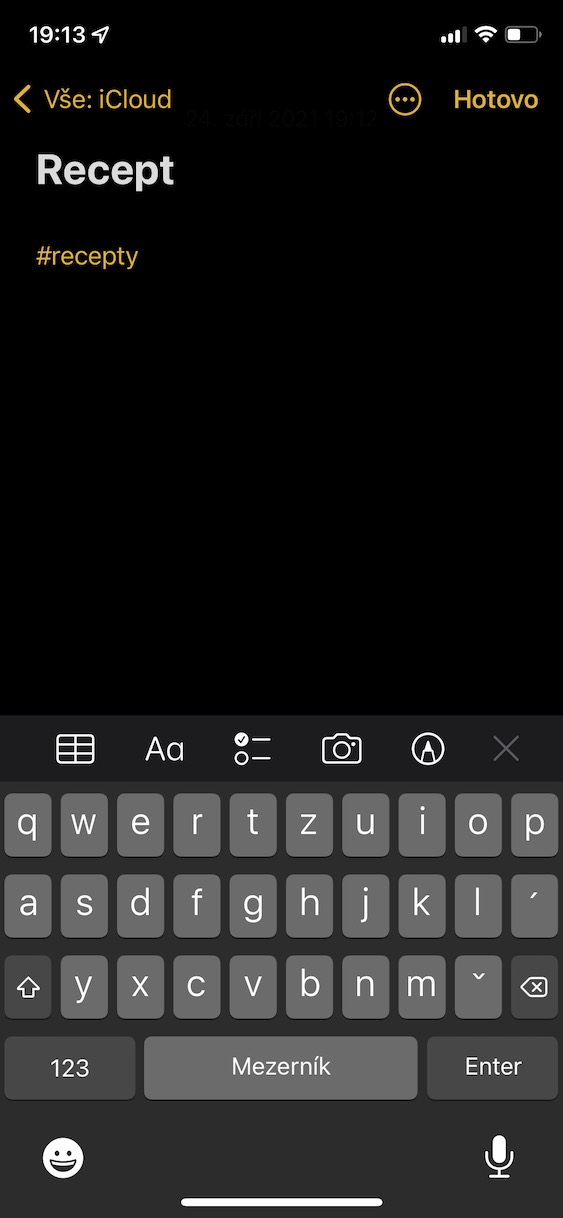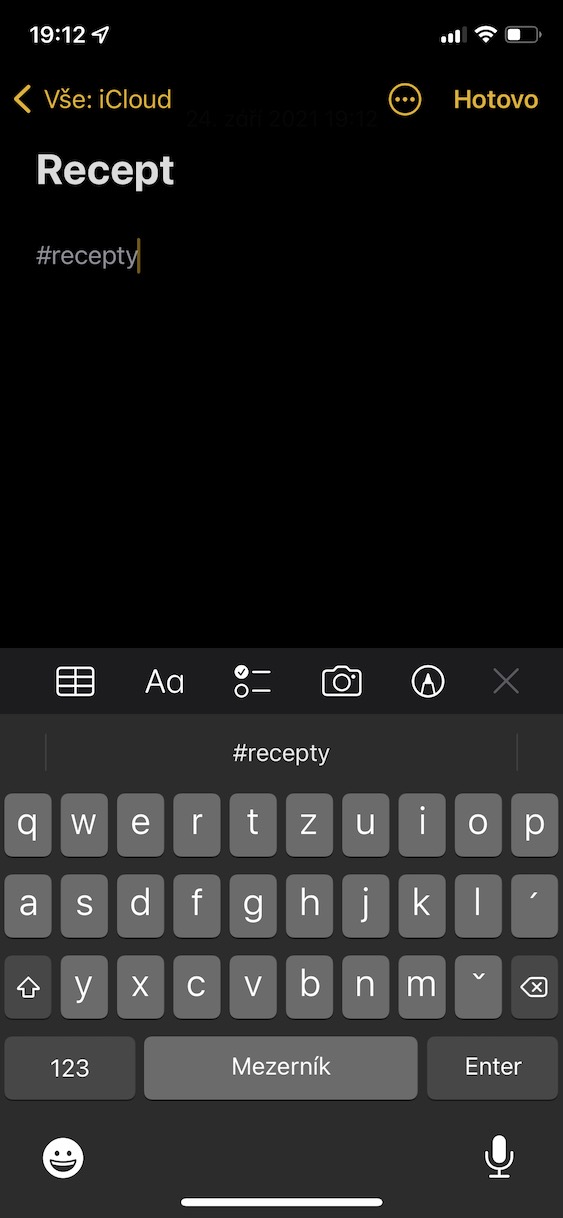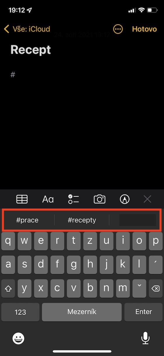 Součástí aplikace Poznámky jsou v iOS 15 a dalších nových systémech také značky, chcete-li moderně hashtagy. Tyto značky fungují naprosto stejně, jako v rámci sociálních sítí. Pokud tedy v nějaké poznámce vytvoříte značku (hashtag), tak si poté můžete zobrazit ostatní poznámky, které disponují stejnou značkou. V poznámce je možné značku vytvořit tak, že napíšete křížek, tedy #, a poté ihned za něj určité vystihující slovo. Ku příkladu, pokud máte v poznámkách recepty a všechny je označíte značkou #recepty, tak si je následně budete schopni zobrazit pěkně po kupě. Při psaní značky se vám nad klávesnicí začnou objevovat návrhy jiných značek. Veškeré značky najdete na úvodní stránce, a to dole v sekci Značky.