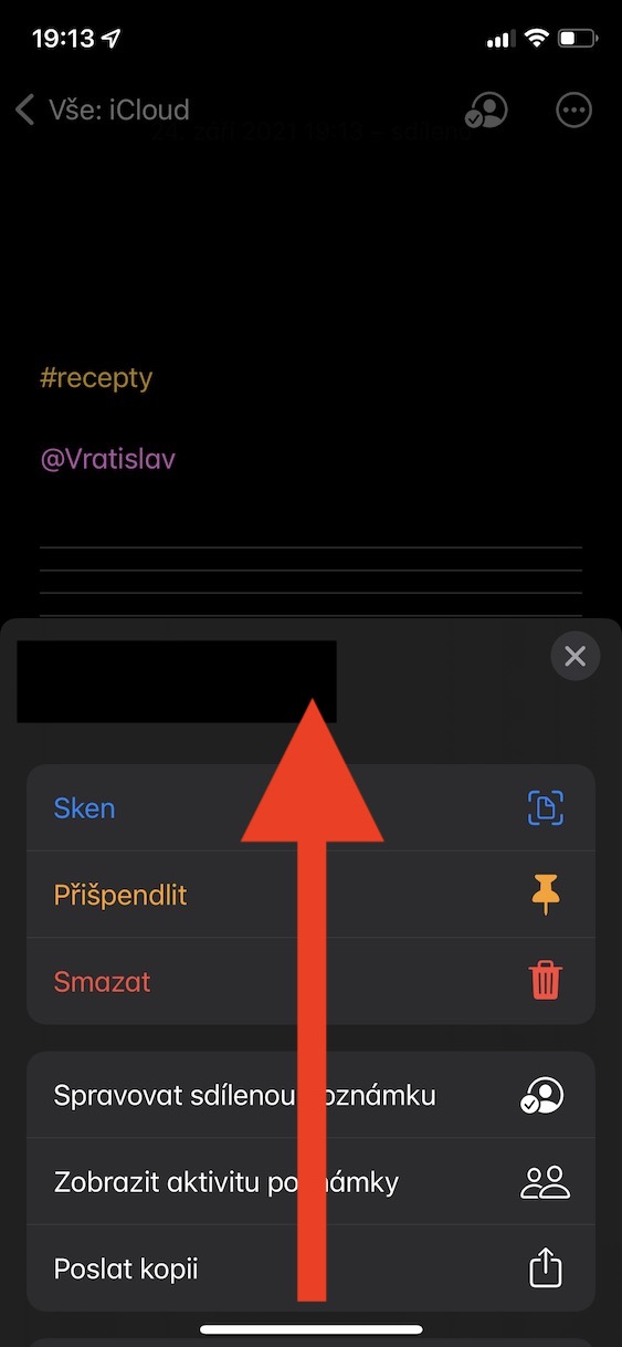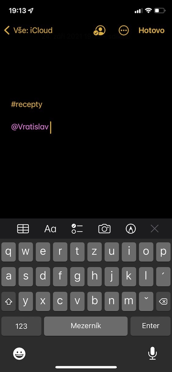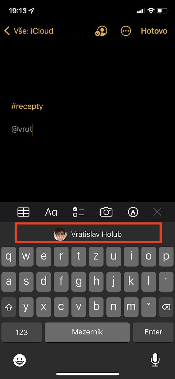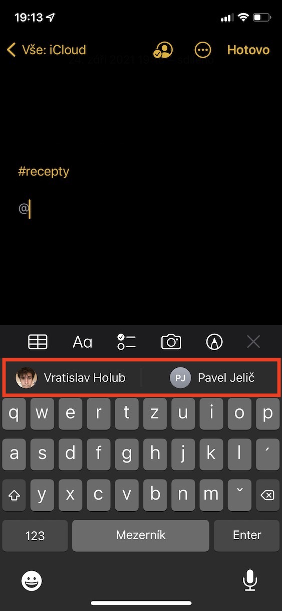 Jakoukoliv vytvořenou poznámku můžete s kýmkoliv jednoduše sdílet – stačí, aby měl dotyčný jedinec Apple zařízení, a aby samozřejmě nativní Poznámky využíval. Ve sdílených poznámkách můžete nově využít také značky, díky kterým je možné konkrétního editora sdílené poznámky na něco upozornit. Zmínku vytvoříte stejně jako například v iMessage či v jiných komunikačních aplikacích. Stačí napsat zavináč, tedy @, a za něj pak jméno uživatele, kterého chcete zmínit. Výsledná zmínka pak bude může vypadat následovně @Vratislav, popřípadě třeba @Jiří. Při psaní zmínky se vám nad klávesnicí začnou objevovat návrhy jmen.