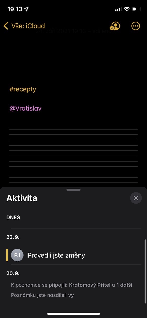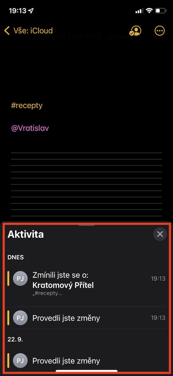 Jestliže s vašimi přáteli, rodinou či kolegy využíváte sdílené poznámky, tak už jste se dost možná někdy v minulosti ocitli v situaci, ve které jste chtěli zjistit, jaké změny konkrétní uživatel při vaší nepřítomnosti provedl. Až do iOS 15 jste si žádnou formu zobrazení historie aktivity a úprav zobrazit nemohli. To se však nyní naštěstí mění a v případě, že to potřebujete, tak si můžete kompletní historii zobrazit. Stačí se přesunout do sdílené poznámky, a poté vpravo nahoře klepnout na ikonu tří teček v kruhu. Z menu ve spodní části obrazovky pak vyberte možnost Zobrazit aktivitu poznámky.