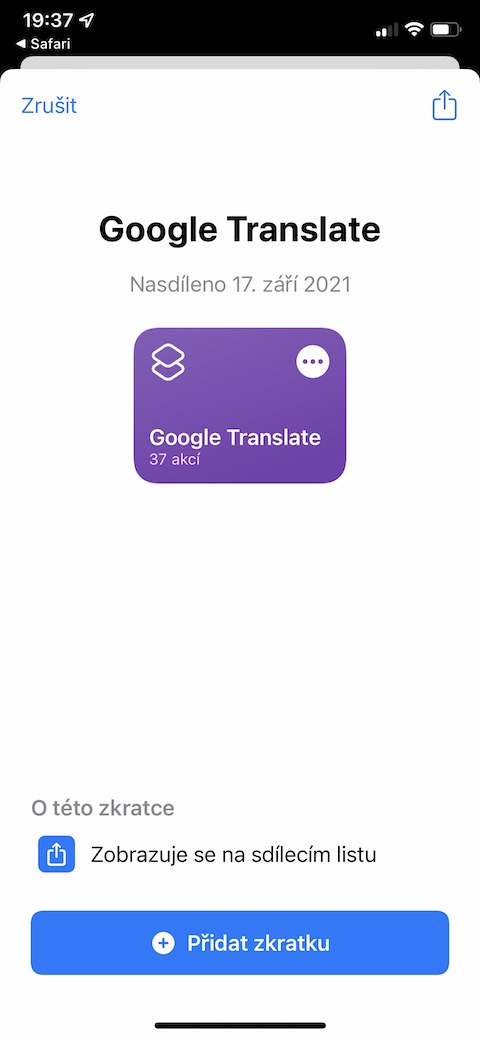 S pomocí zkratky jménem Google Translate si můžete na vašem iPhonu nechat kdykoiv snadno a rychle přeložit stránku, kterou máte právě otevřenou na vašem webovém prohlížeči. Zkratka se automaticky přidá do listu sdílení, pro její spuštění tedy vždy postačí klepnout na příslušnou ikonku a vybrat zkratku v menu.