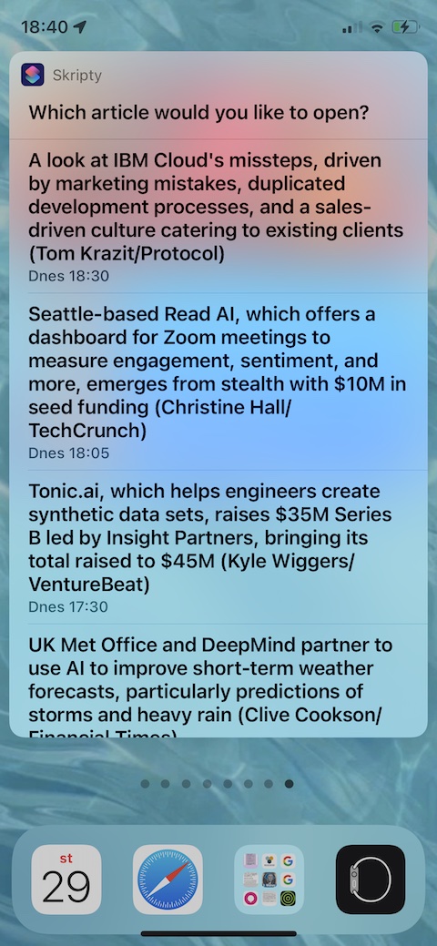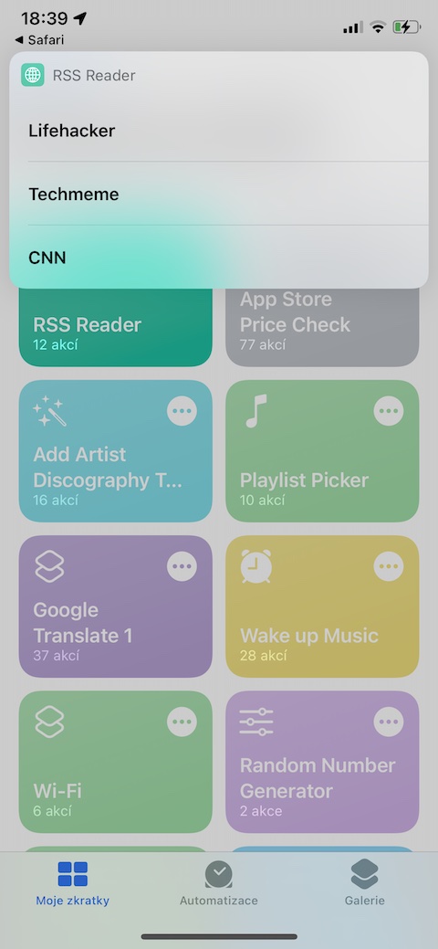 Zkratka RSS Reader vám po své aktivaci automaticky zobrazí přehled nejnovějších zpráv z vašich oblíbených zpravodajských zdrojů. Ve výchozím nastavení najdete v RSS Reader servery Lifehacker, Techmeme a CNN, po klepnutí na tři tečky v pravém horním rohu karty zkratky si můžete ale samozřejmě přidat své vlastní zdroje.