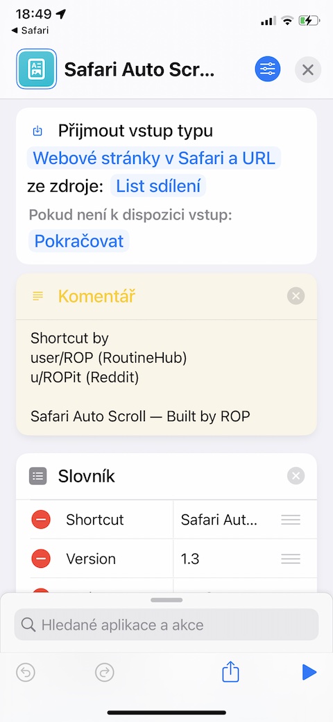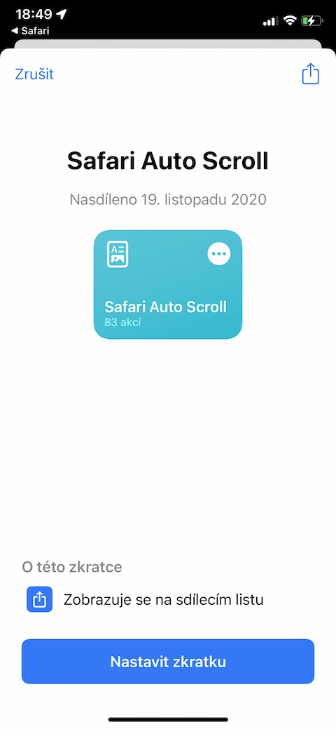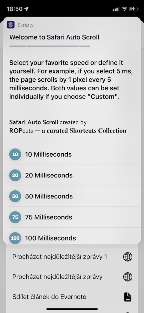 Jak název napovídá, Safari Auto Scroll je šikovná a zajímavá zkratka, s jejíž pomocí můžete na webových stránkách v prohlížeči Safari na vašem iPhonu zahájit automatické procházení, aniž byste museli hnout prstem. Po spuštění zkratky z listu sdílení v Safari se vám otevře menu, ve kterém následně určíte, jakou rychlostí má docházet k prohlížení stránky.