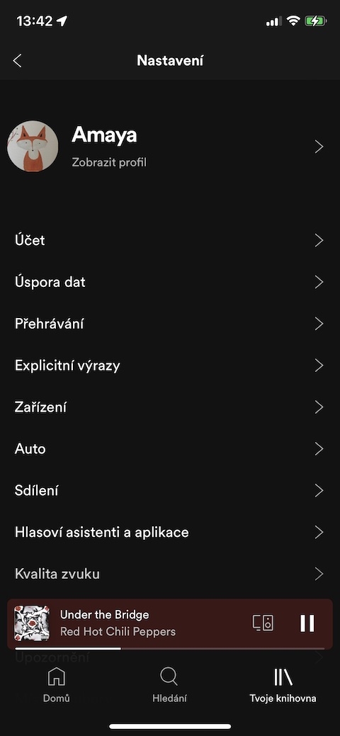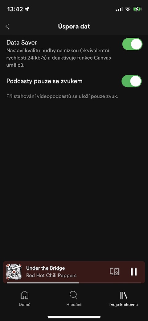 Pokud se se svým iPhonem se Spotify chystáte vyrazit někam, kde nebudete mít možnost připojení na Wi-Fi síť, určitě uvítáte možnost úspory dat. Vpravo dole klepněte na Tvoje knihovna a poté klepněte v levém horním rohu na ikonku vašeho profilu. Zvolte Úspora dat, kde můžete aktivovat funkci Data Saver a možnost stahování pouze zvukové složky videopodcastů.